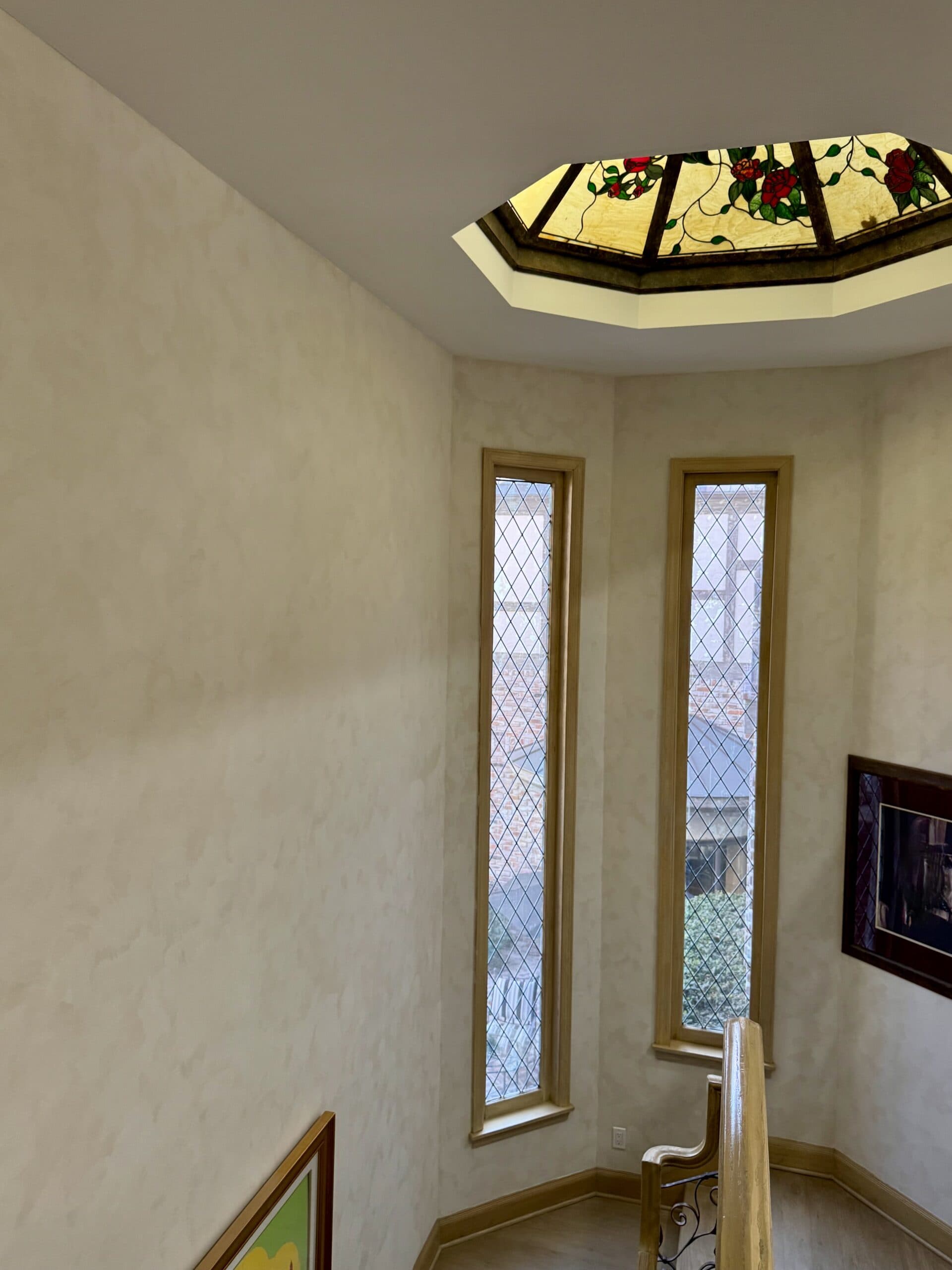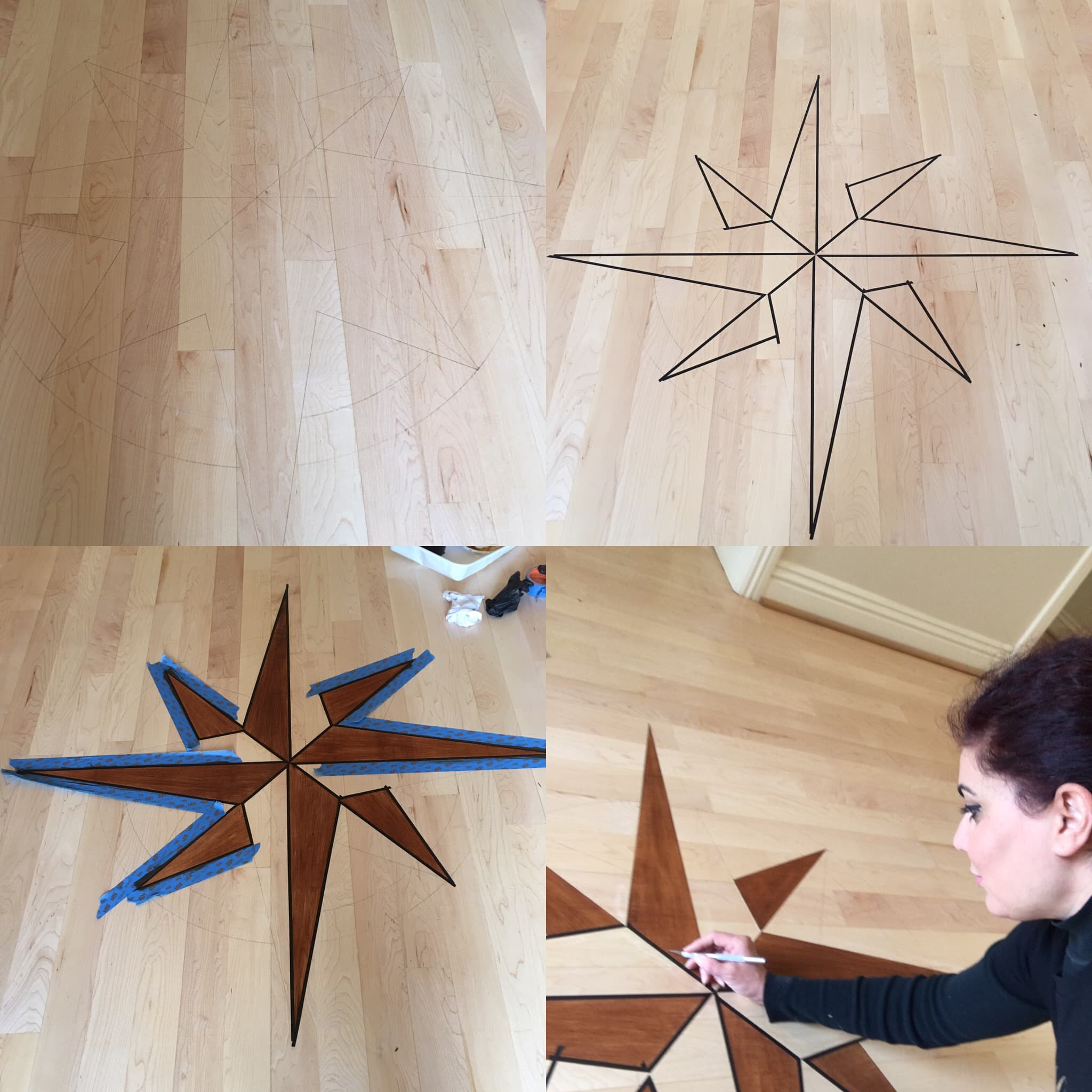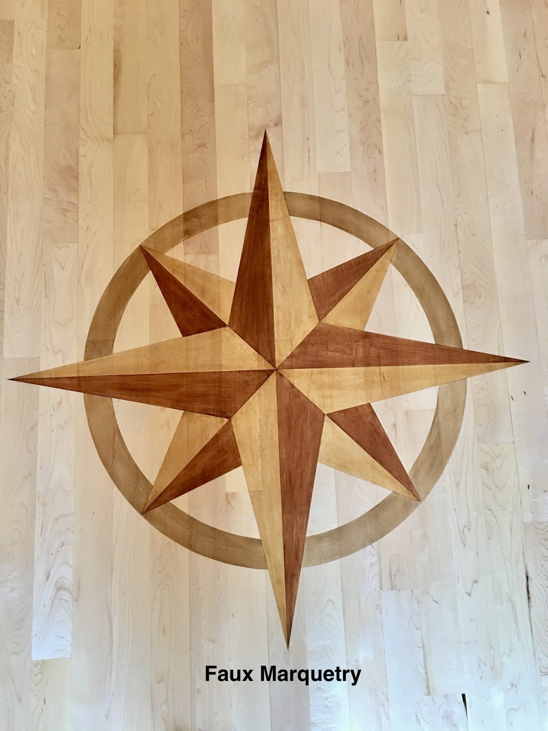A masterful decorative technique that mimics the intricate artistry of traditional marquetry. This process involves applying different shades of stain to wood, creating the illusion of inlaid patterns and delicate designs without the need for actual wood inlays. Faux marquetry enhances floors, furniture, and architectural details.