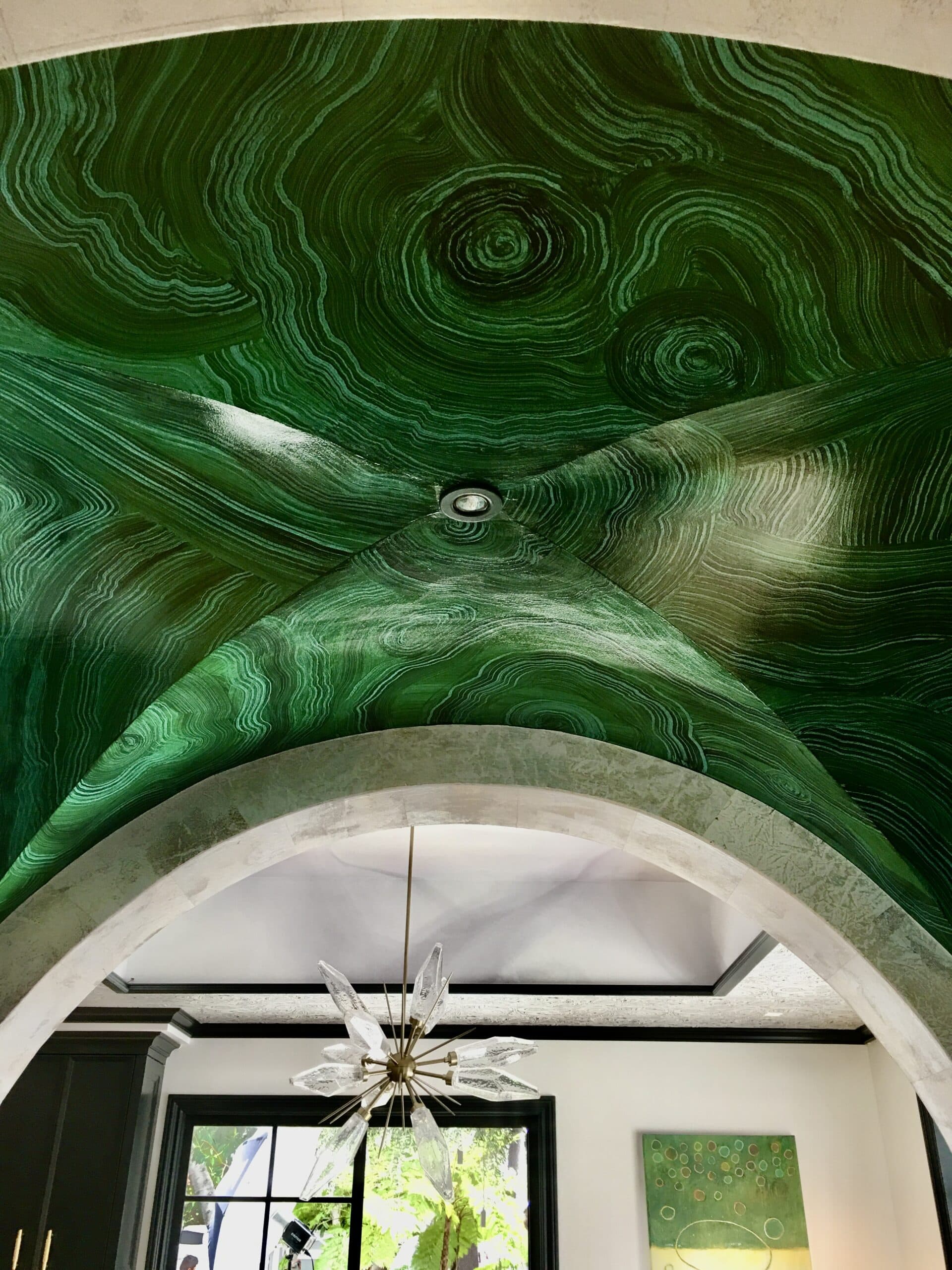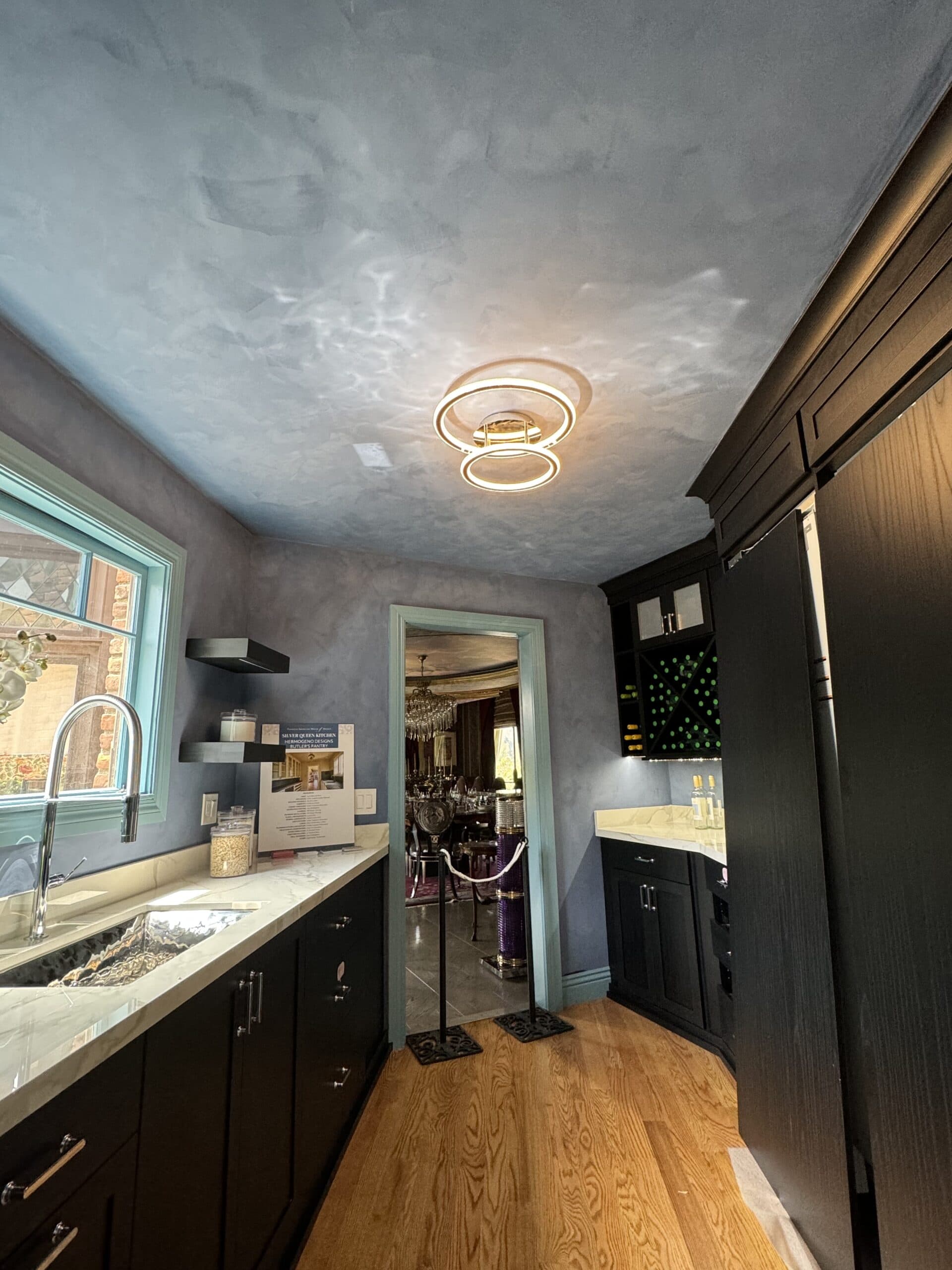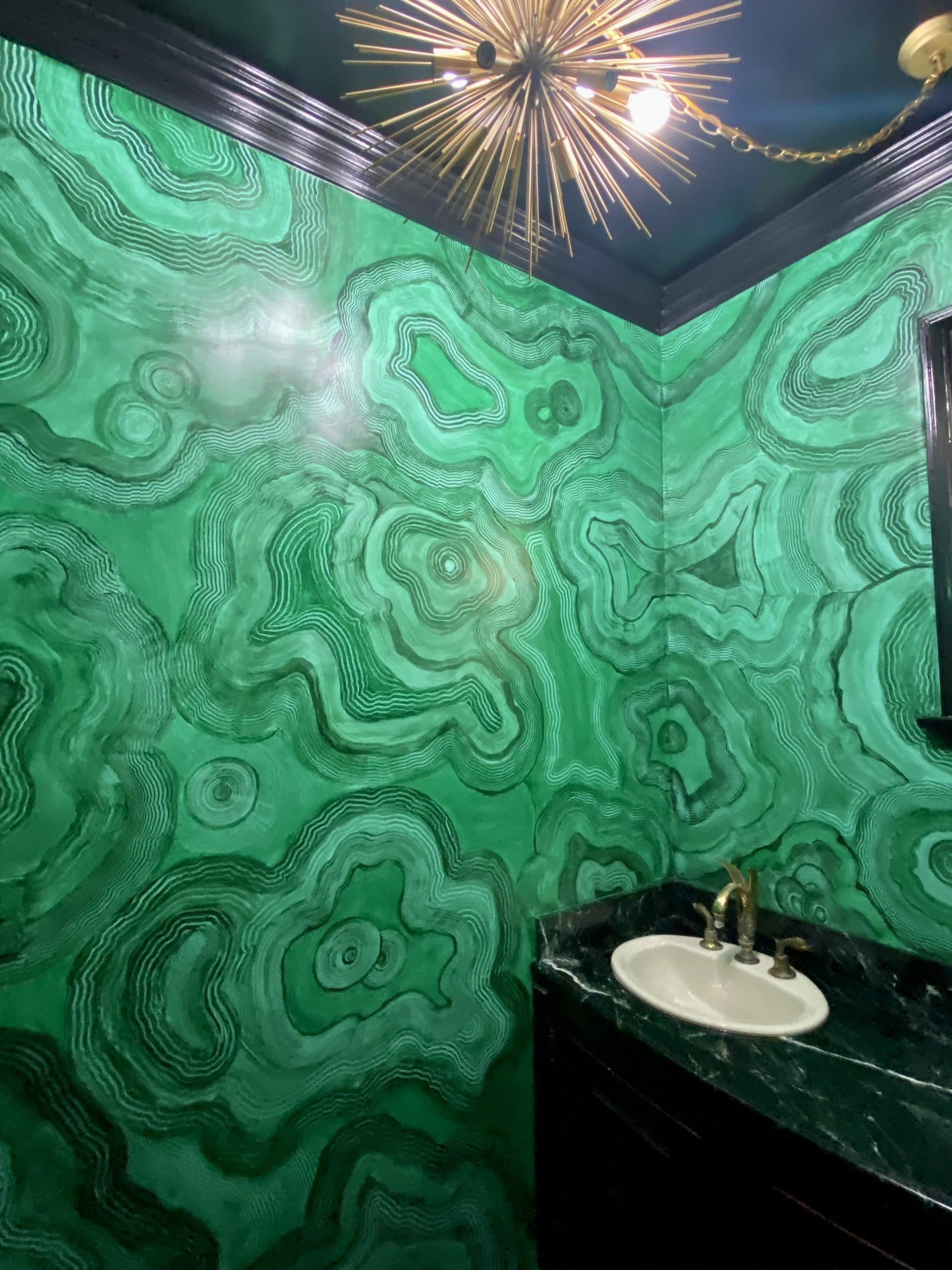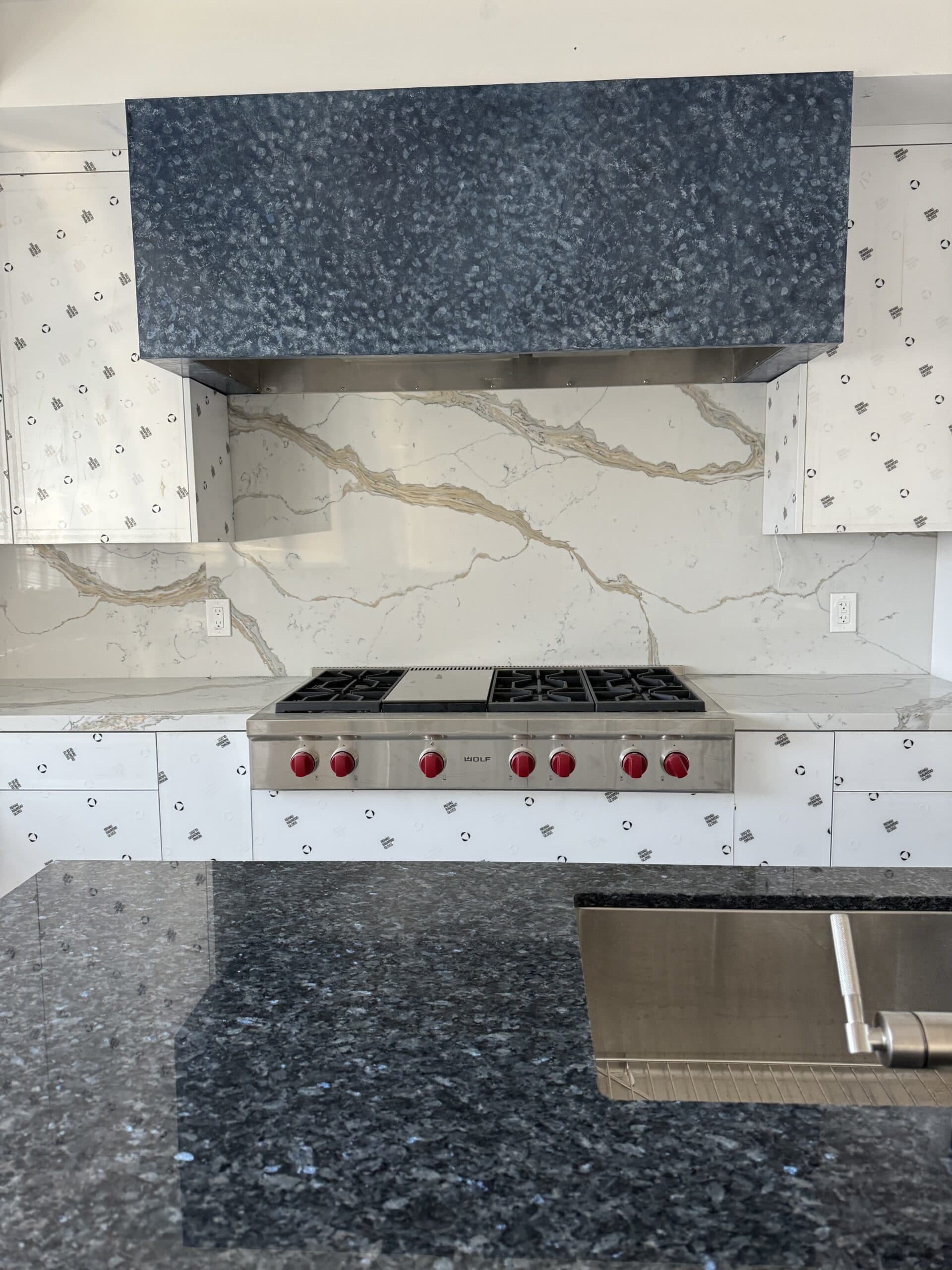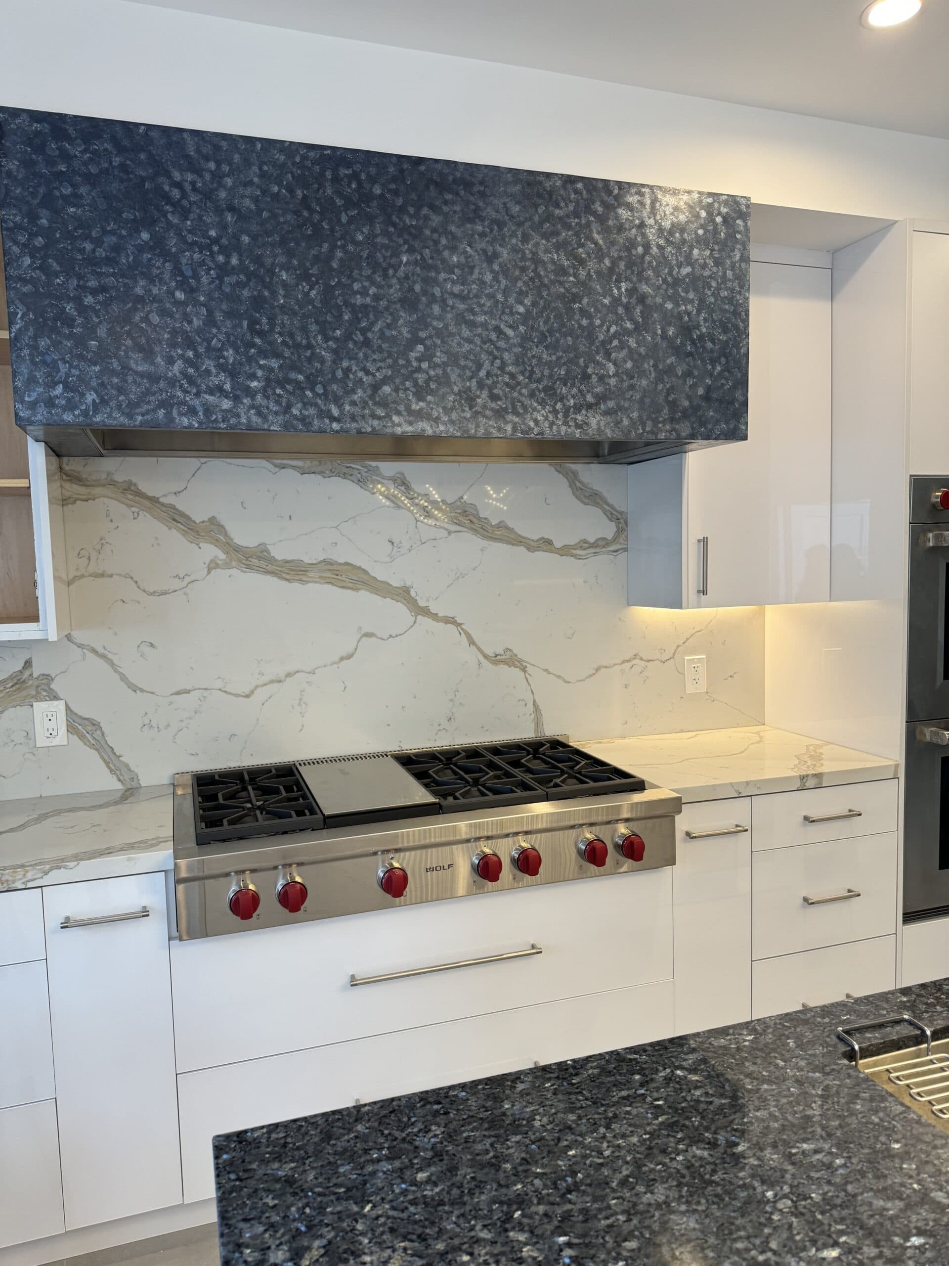 This finish is designed to replicate the depth and shimmer of Blue Pearl granite. This custom technique was used to match the client’s stovetop hood to their existing kitchen island.