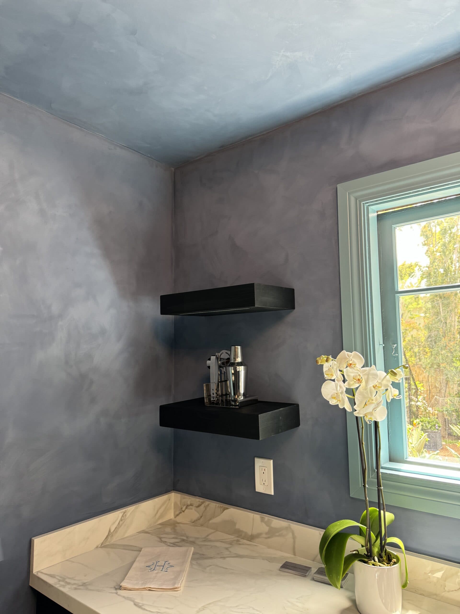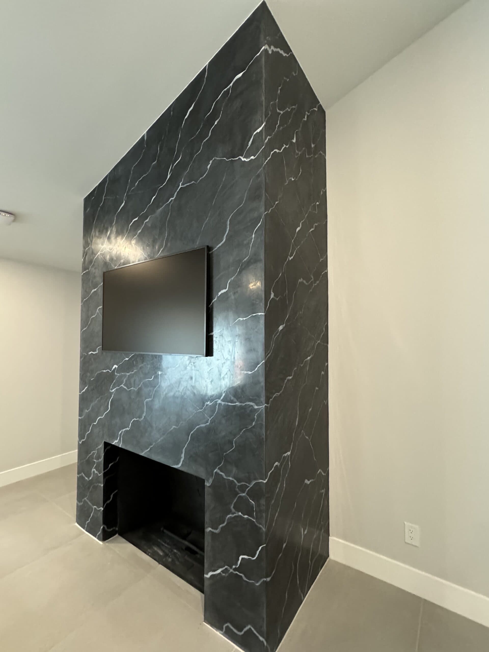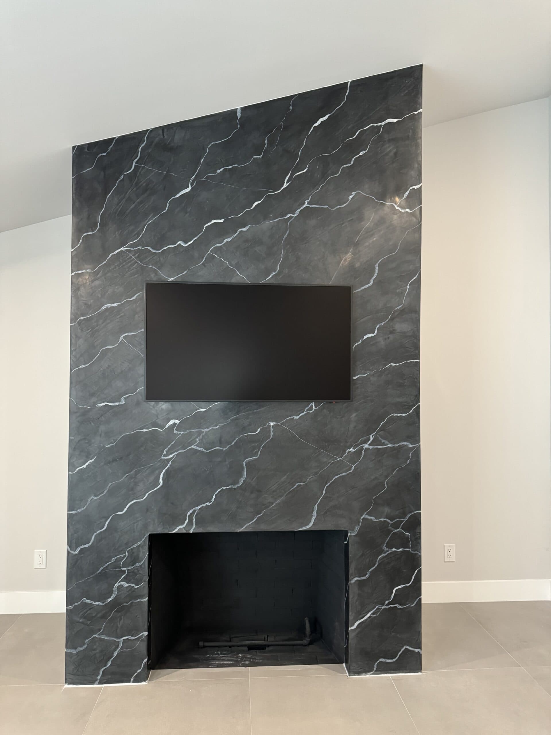 This striking black marble finish is crafted using black Venetian plaster and hand-painted acrylic veining to replicate the natural beauty of Nero Marquina marble. Applied to a modern fireplace, this technique achieves the depth and luxury of real stone while offering a seamless and customizable design.