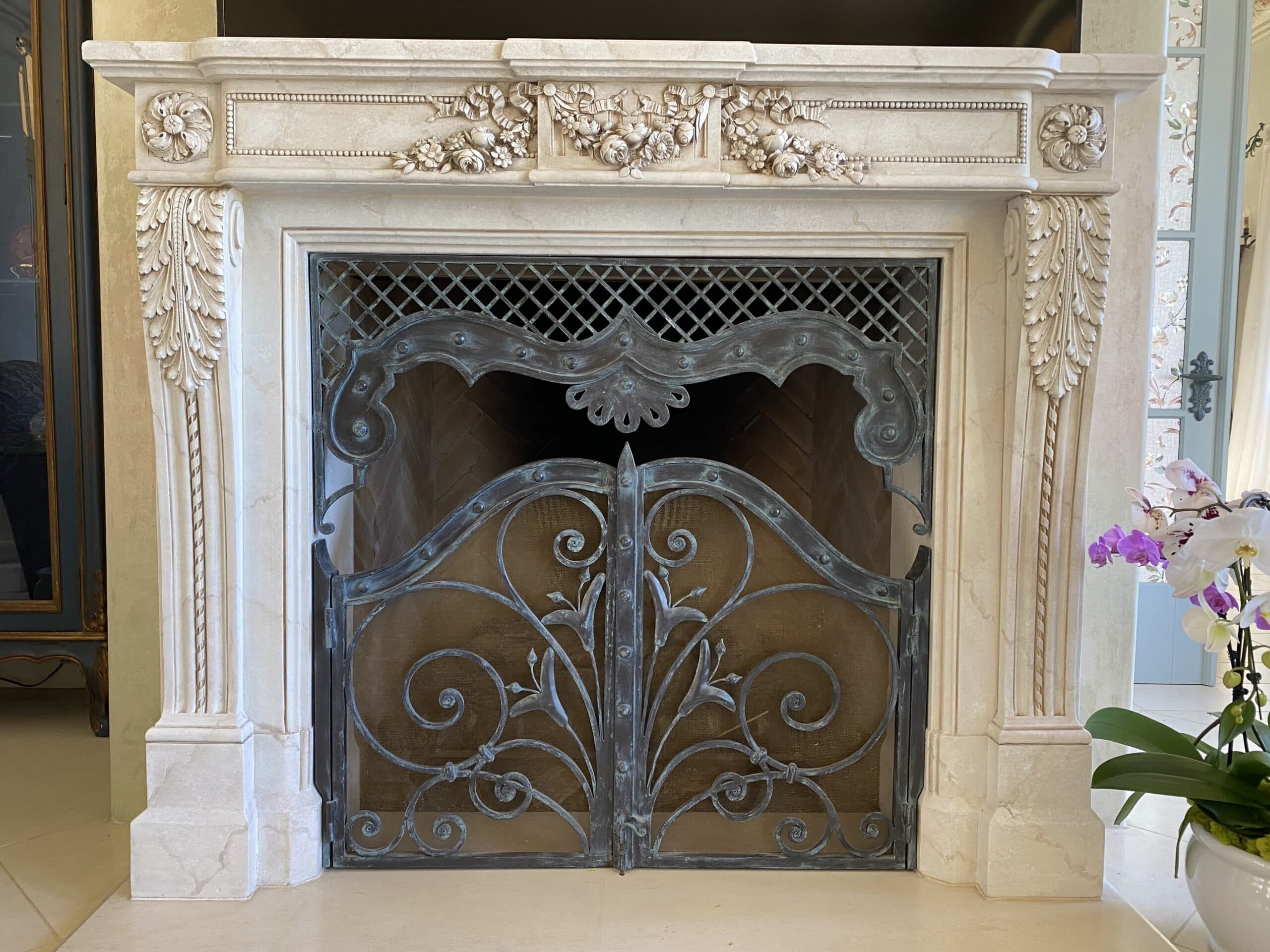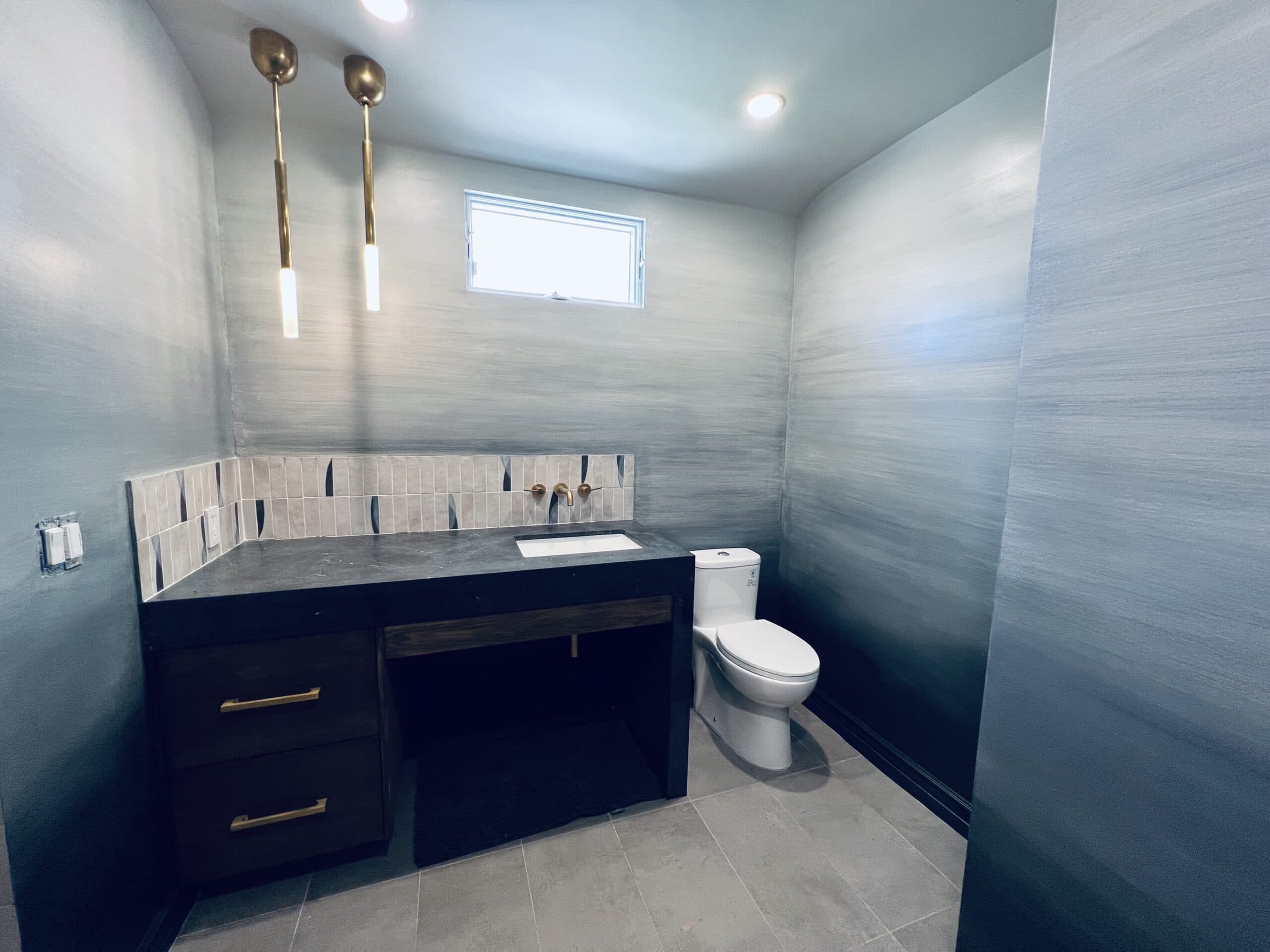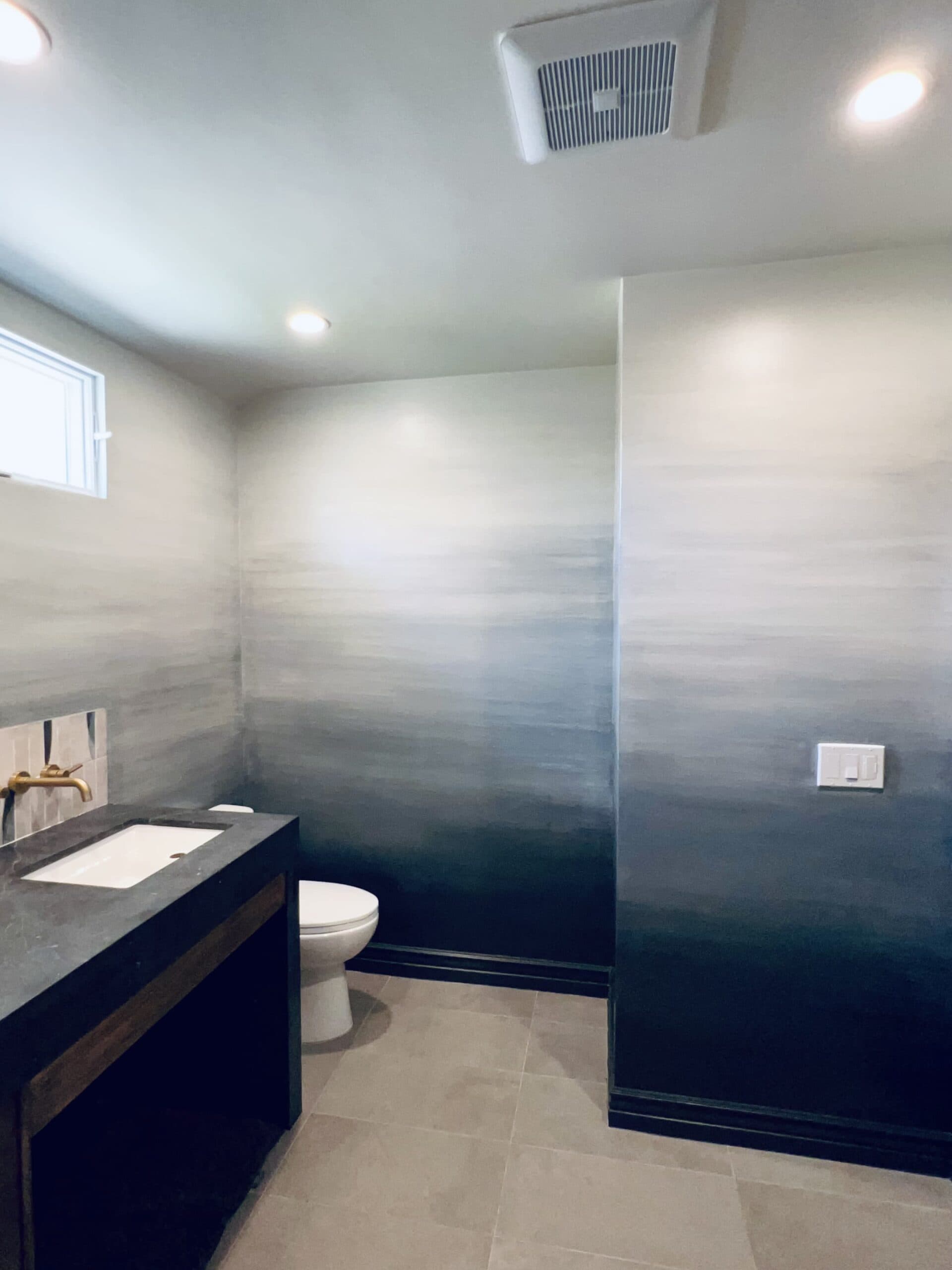This striking black marble finish is crafted using black Venetian plaster and hand-painted acrylic veining to replicate the natural beauty of Nero Marquina marble. Applied to a modern fireplace, this technique achieves the depth and luxury of real stone while offering a seamless and customizable design.