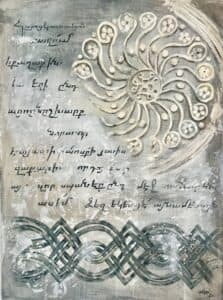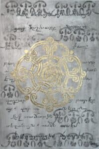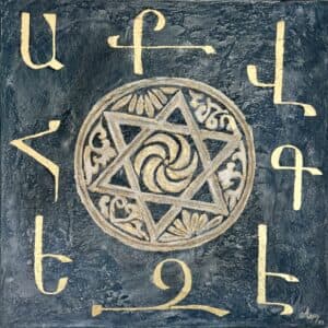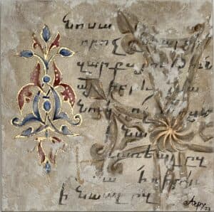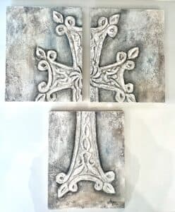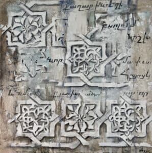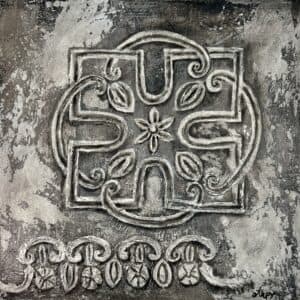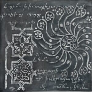 is inspired by centuries-old Armenian ornamental art and architectural elements. This unique collection is a contemporary interpretation of ancient artistry, brought to life through the use of mixed media – including plaster, gold leaf, and other rich textures. Each piece echoes the spirit of sacred craftsmanship, reimagined with a modern, expressive voice.