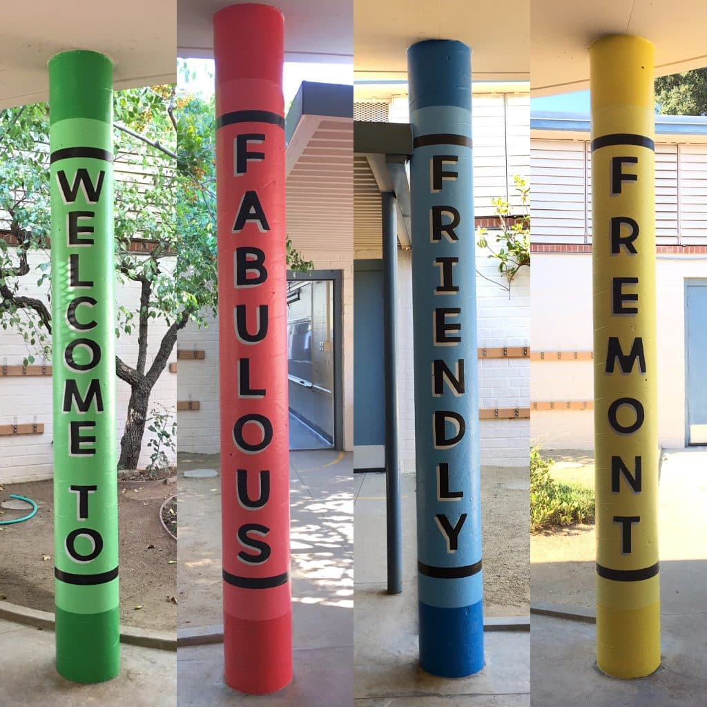 Bringing creativity and school spirit to life, I transformed the entrance columns of Fremont Elementary School into vibrant, oversized crayons, each featuring the school’s inspiring slogan. Extending the theme throughout the hallways, I painted the remaining poles to resemble classic school pencils.