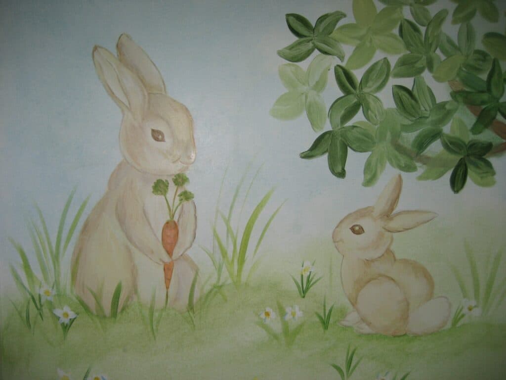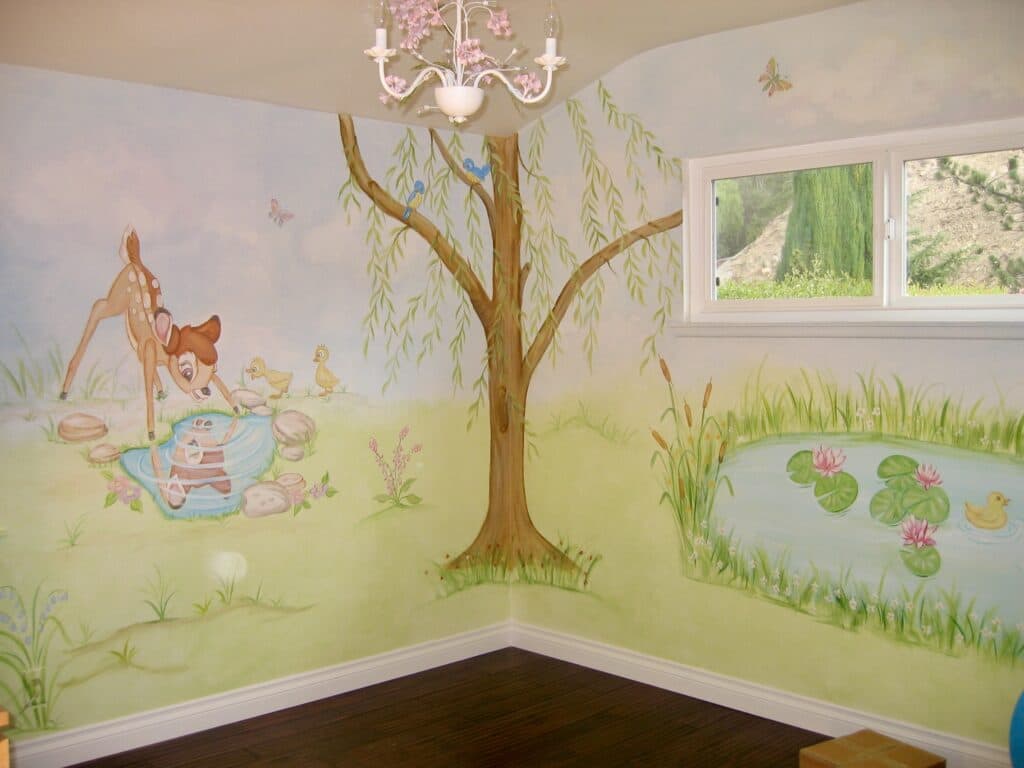This adorable mural is perfect for a baby girl’s nursery, featuring a charming Bambi surrounded by soft pastel flowers. Delicate pink hues create a dreamy and calming atmosphere.