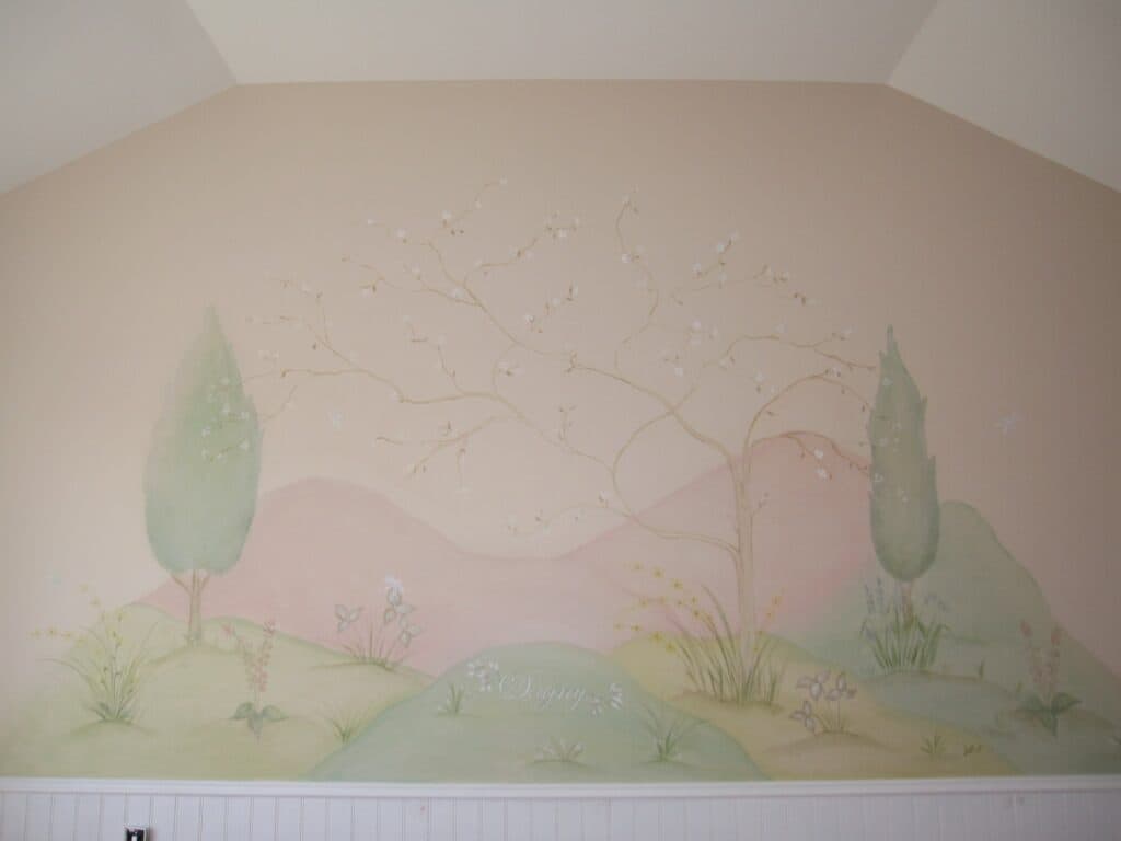 Featuring a gentle bear, a delicate deer and a beautifully detailed tree extends all the way to the ceiling. The artwork is painted in soft, earthy tones to create a warm and soothing atmosphere.