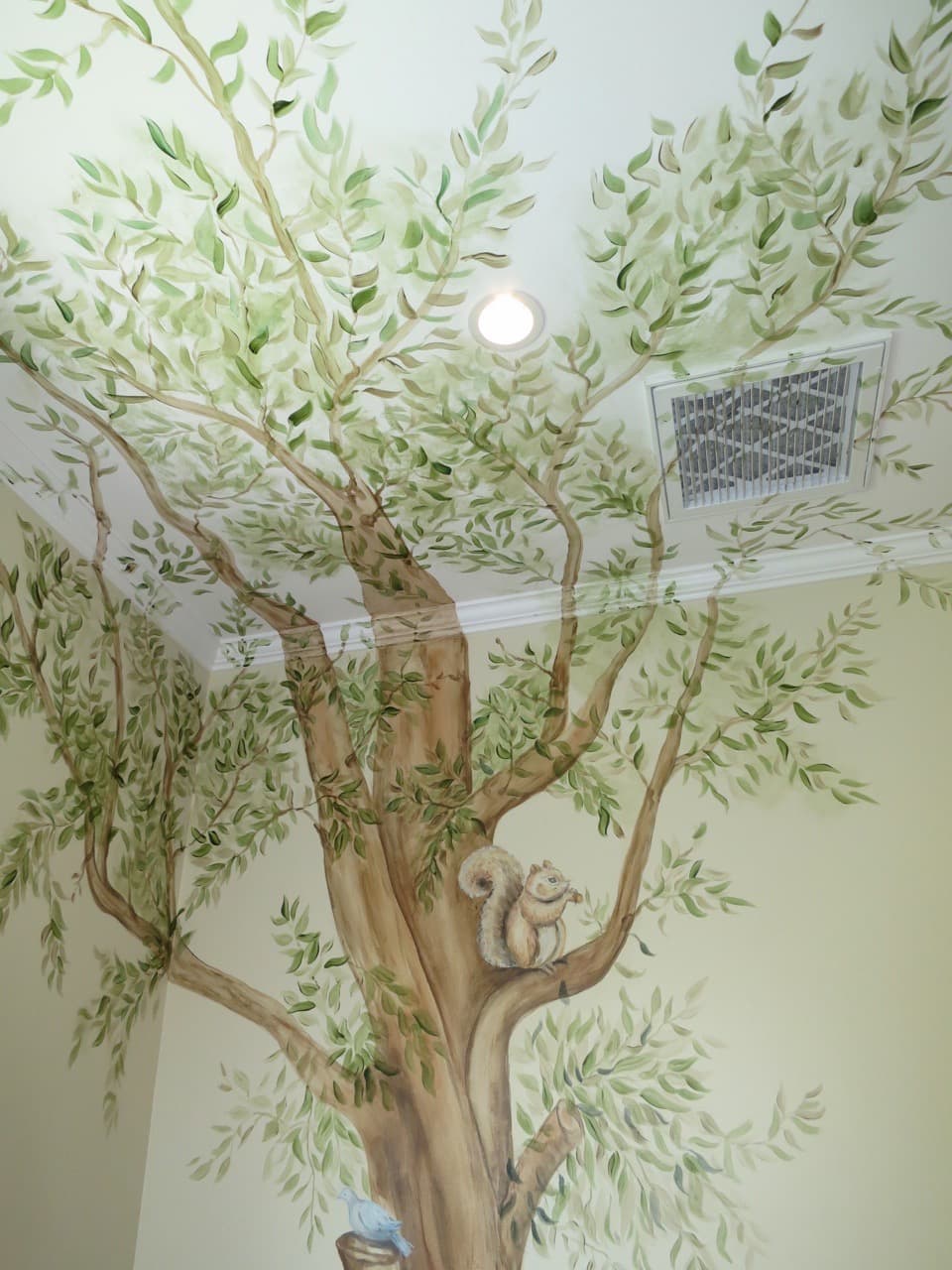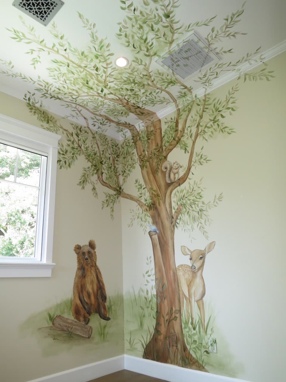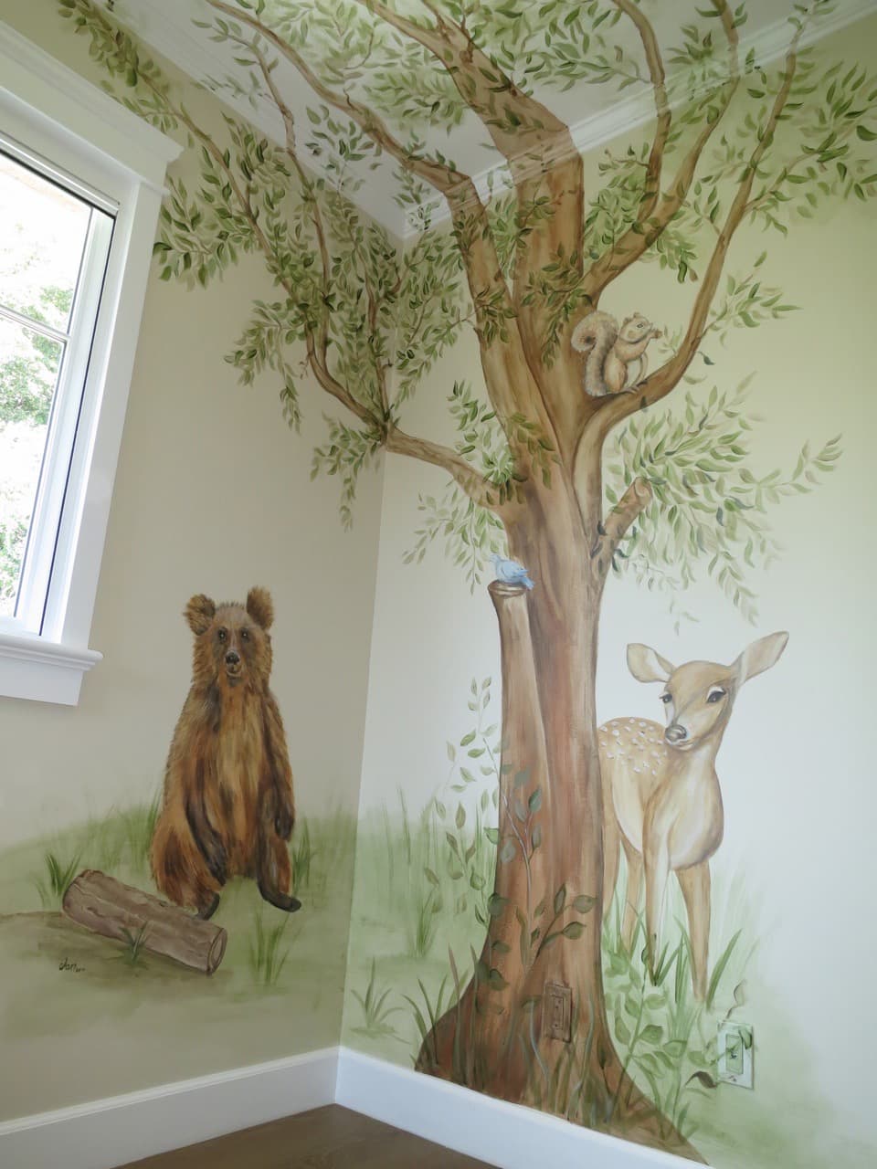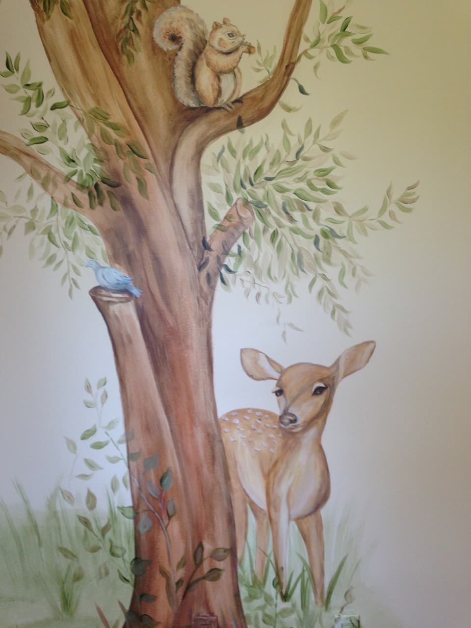 Featuring a gentle bear, a delicate deer and a beautifully detailed tree extends all the way to the ceiling. The artwork is painted in soft, earthy tones to create a warm and soothing atmosphere.