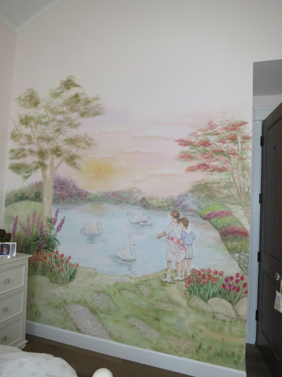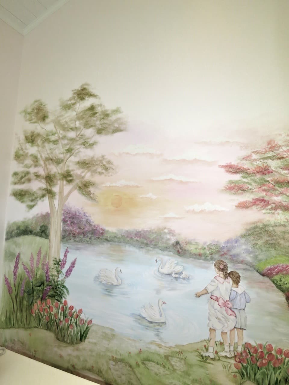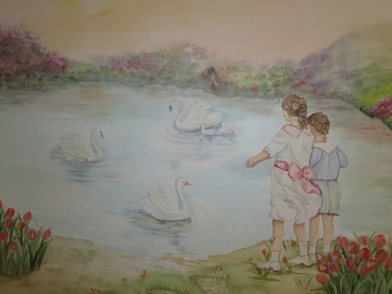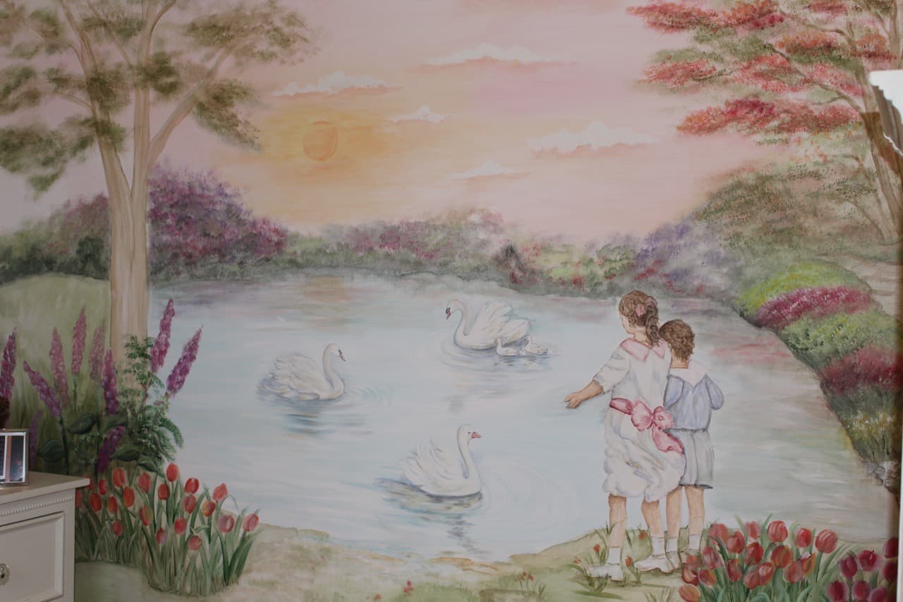 This enchanting mural captures the serenity of a garden scene inspired by Swan Lake. My client requested a personal touch, incorporating her daughter and son into the composition making the artwork a timeless reflection of their childhood.