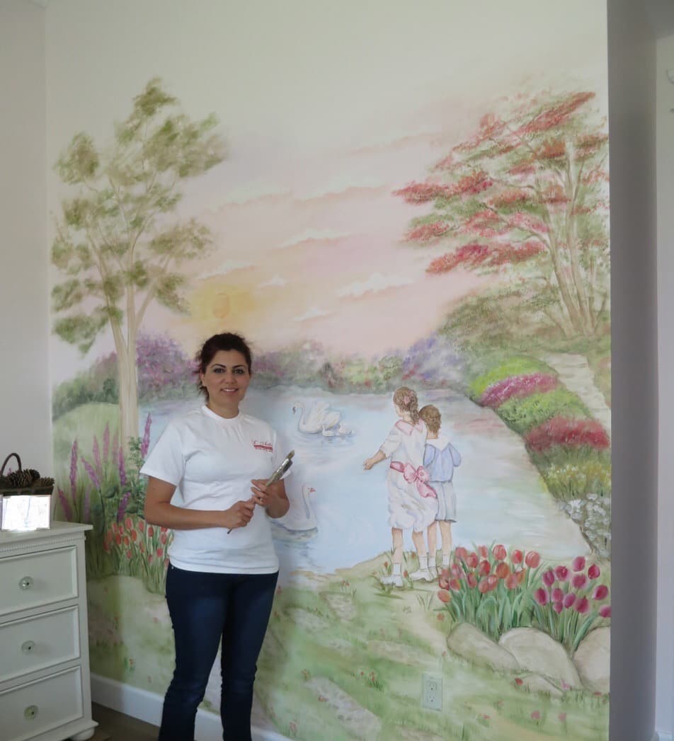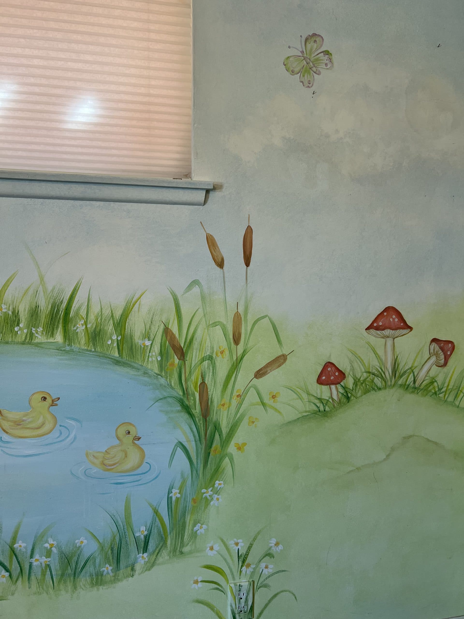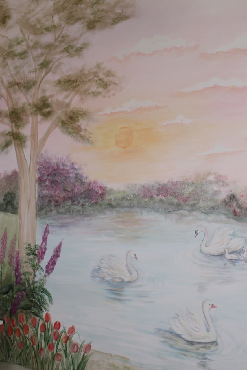 This enchanting mural captures the serenity of a garden scene inspired by Swan Lake. My client requested a personal touch, incorporating her daughter and son into the composition making the artwork a timeless reflection of their childhood.