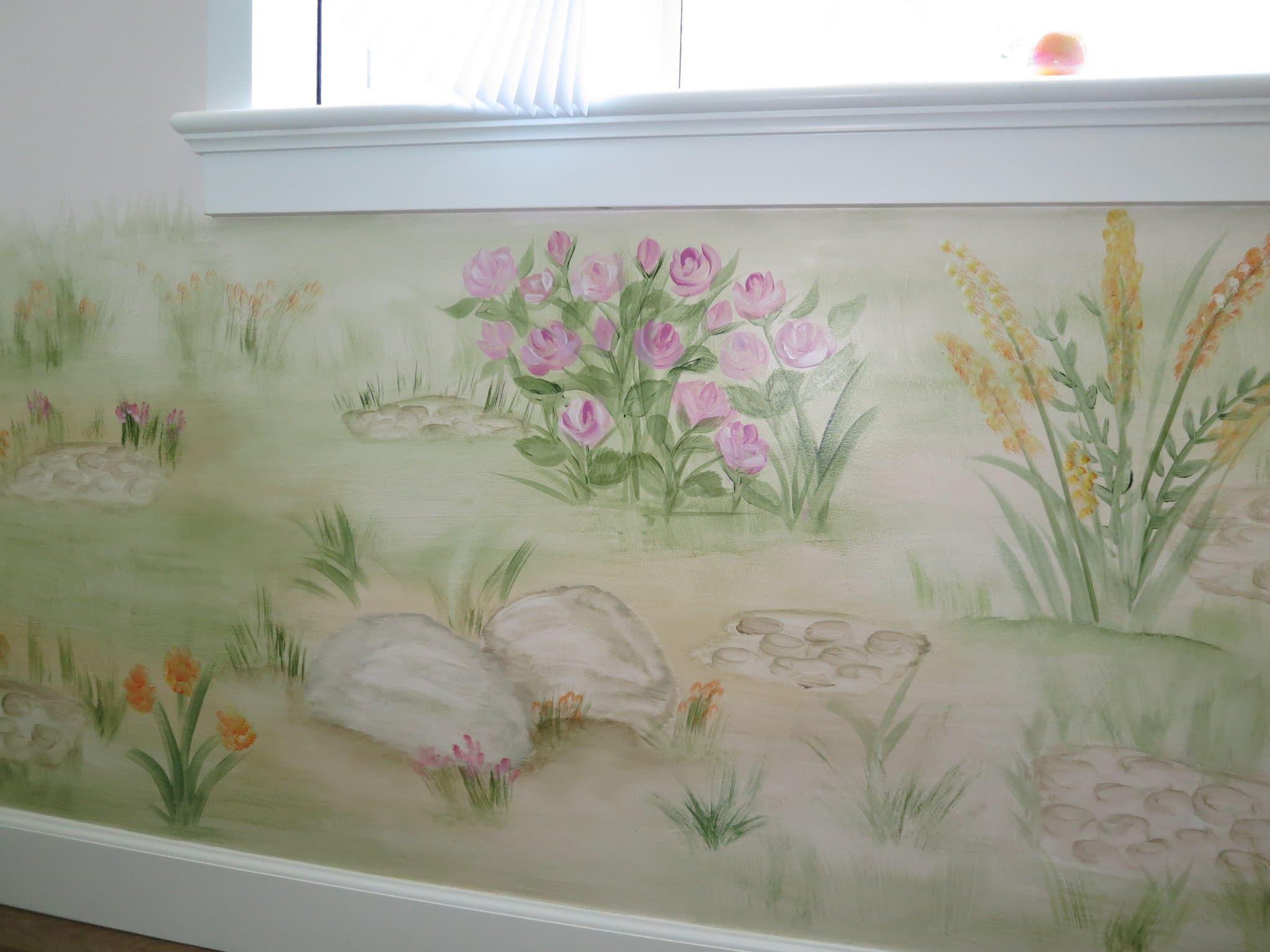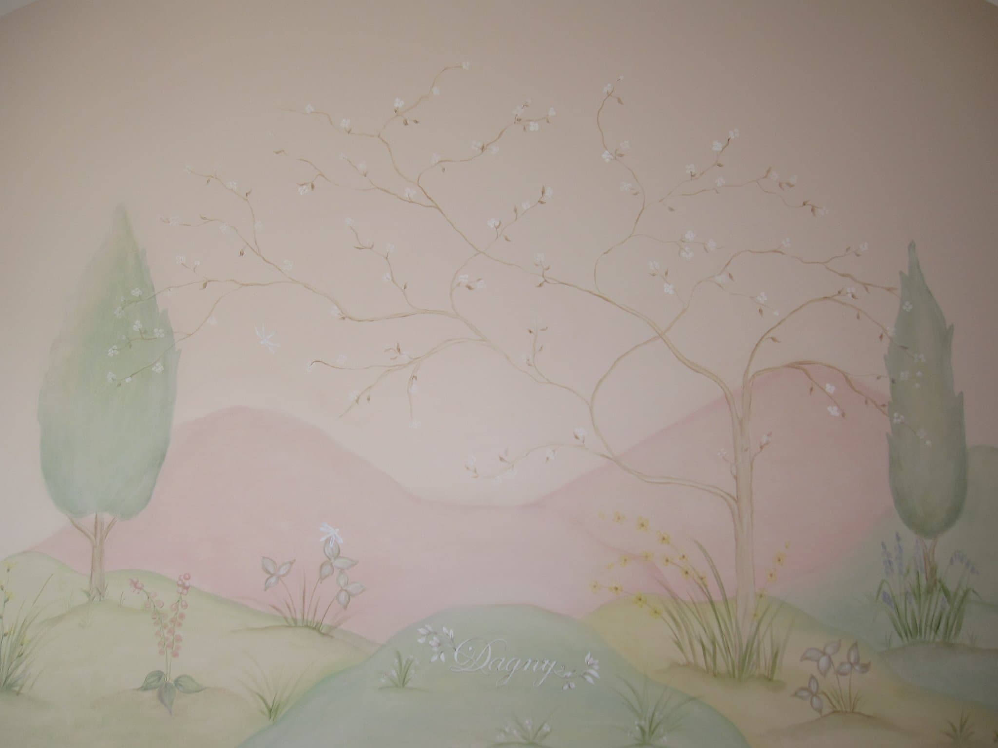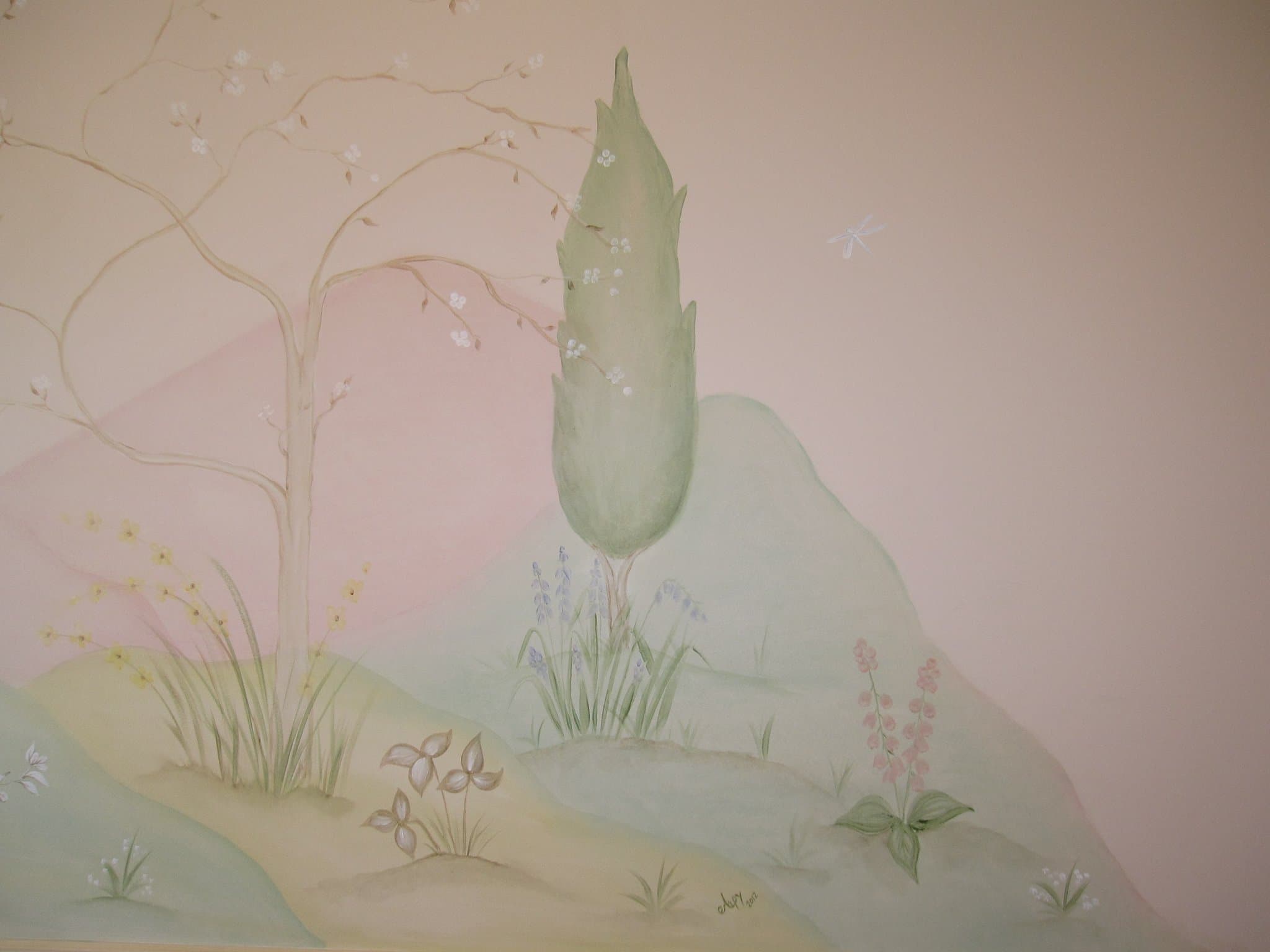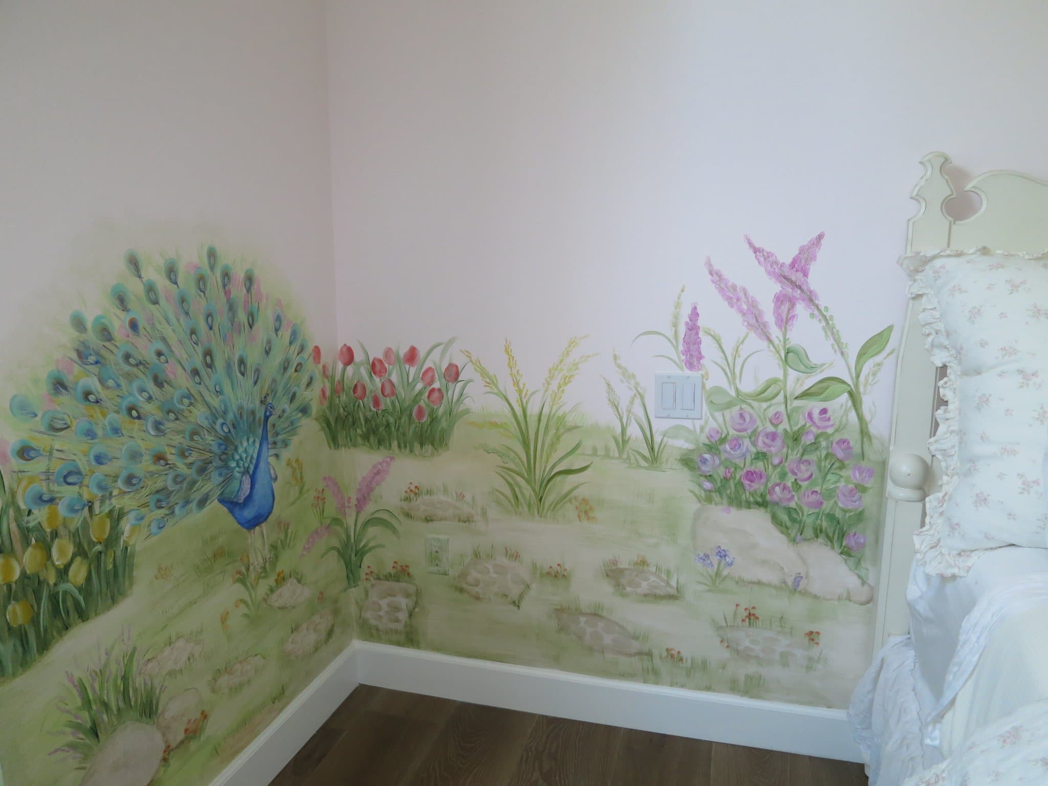 This enchanting mural captures the serenity of a garden scene inspired by Swan Lake. My client requested a personal touch, incorporating her daughter and son into the composition making the artwork a timeless reflection of their childhood.