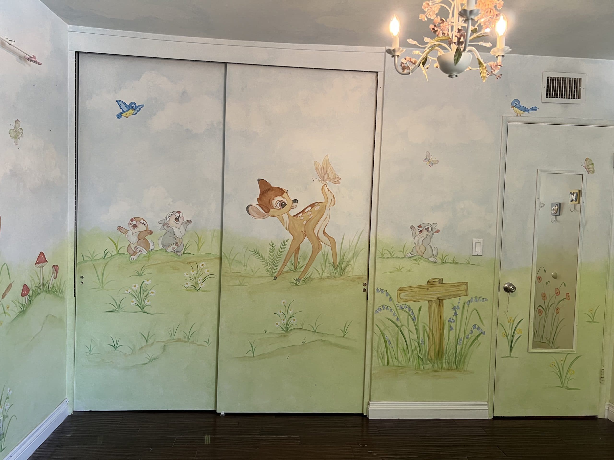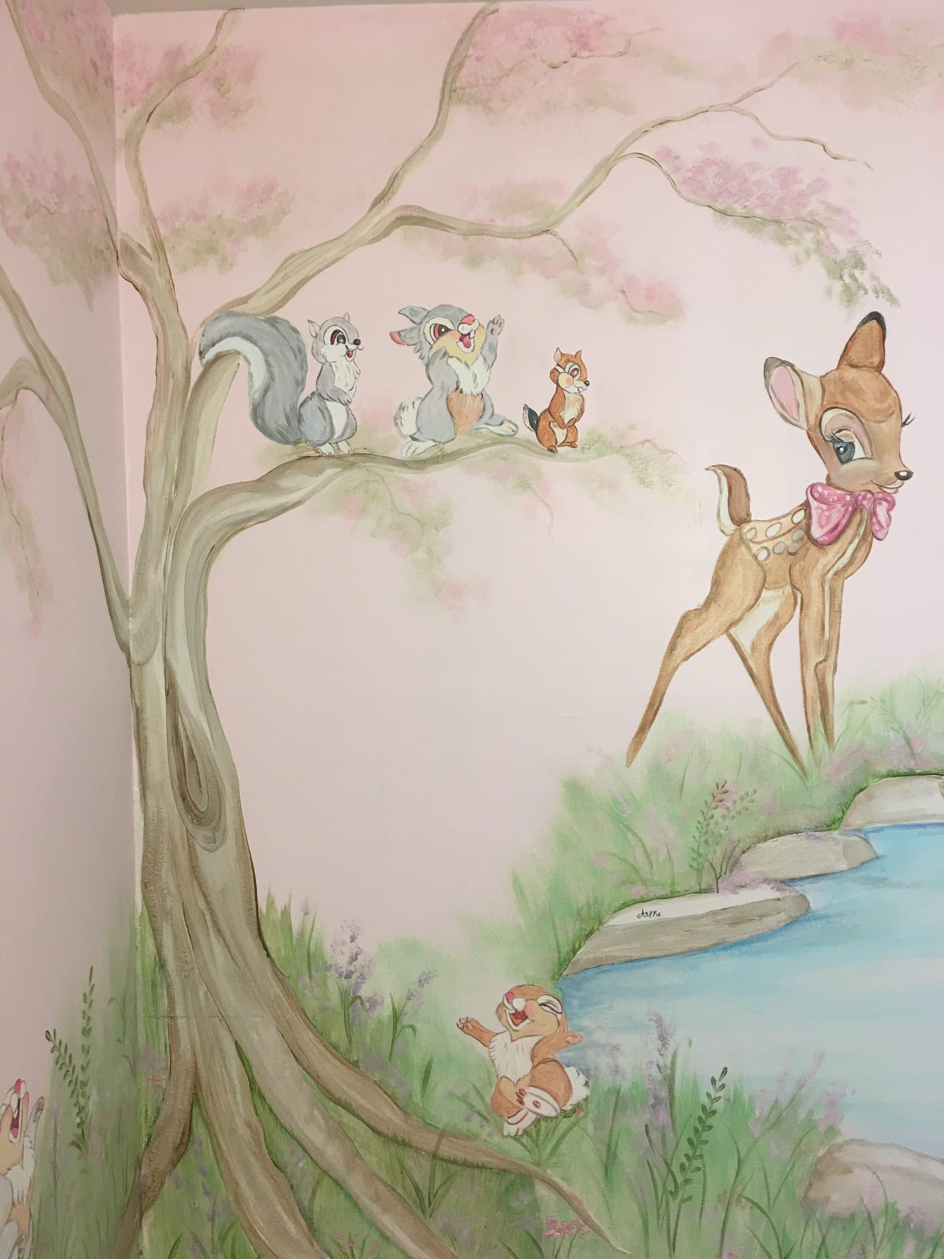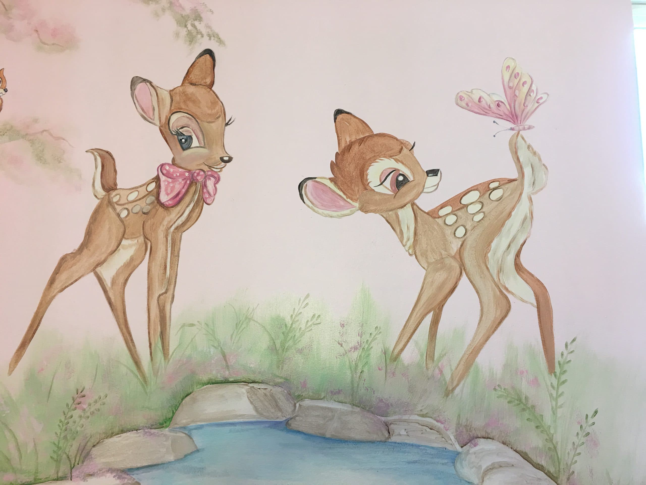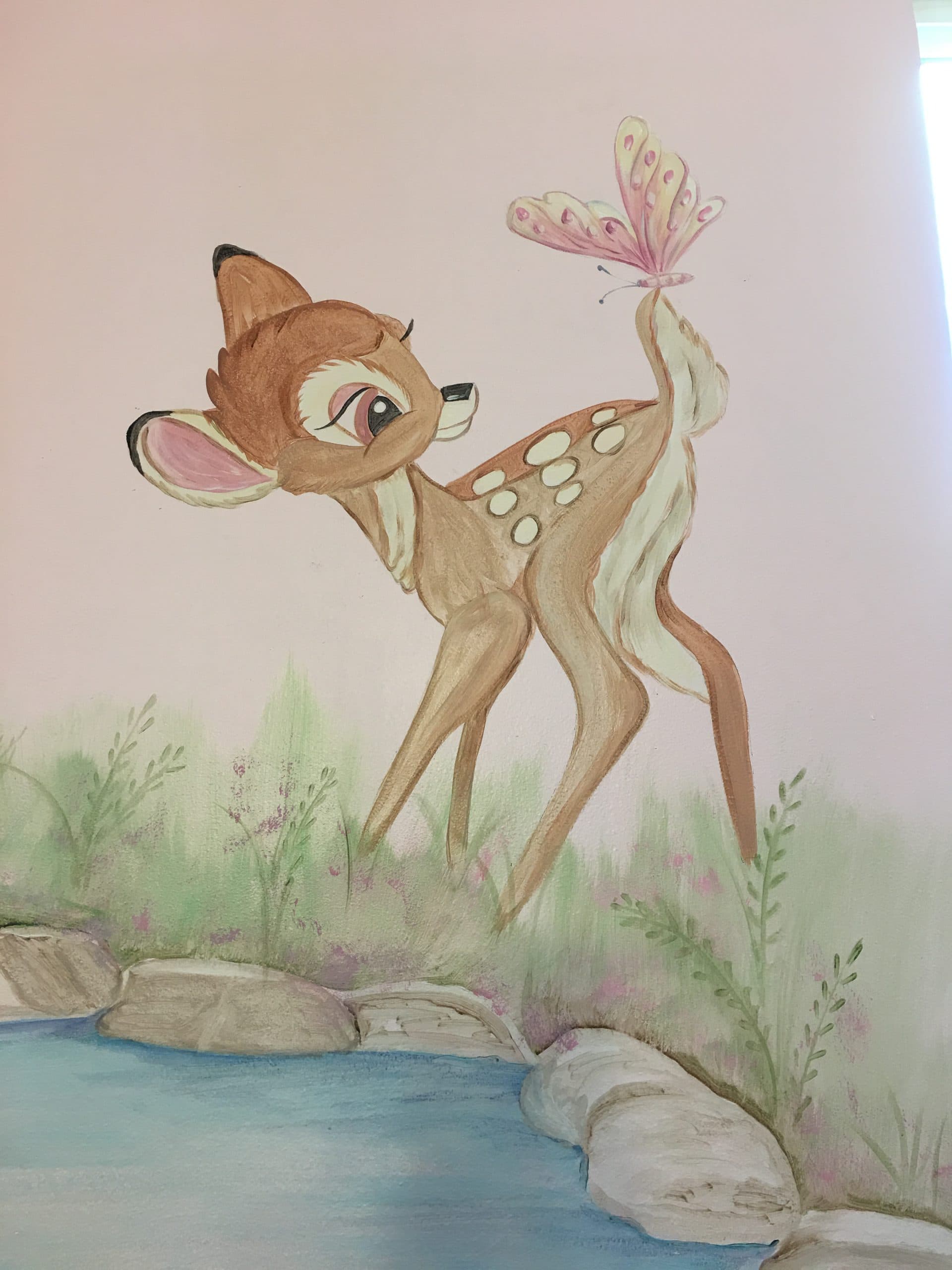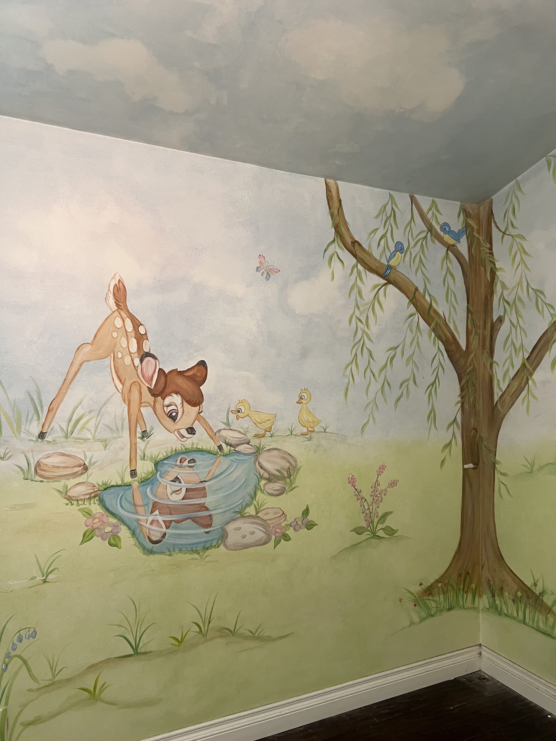 This adorable mural is perfect for a baby girl’s nursery, featuring a charming Bambi surrounded by soft pastel flowers. Delicate pink hues create a dreamy and calming atmosphere.