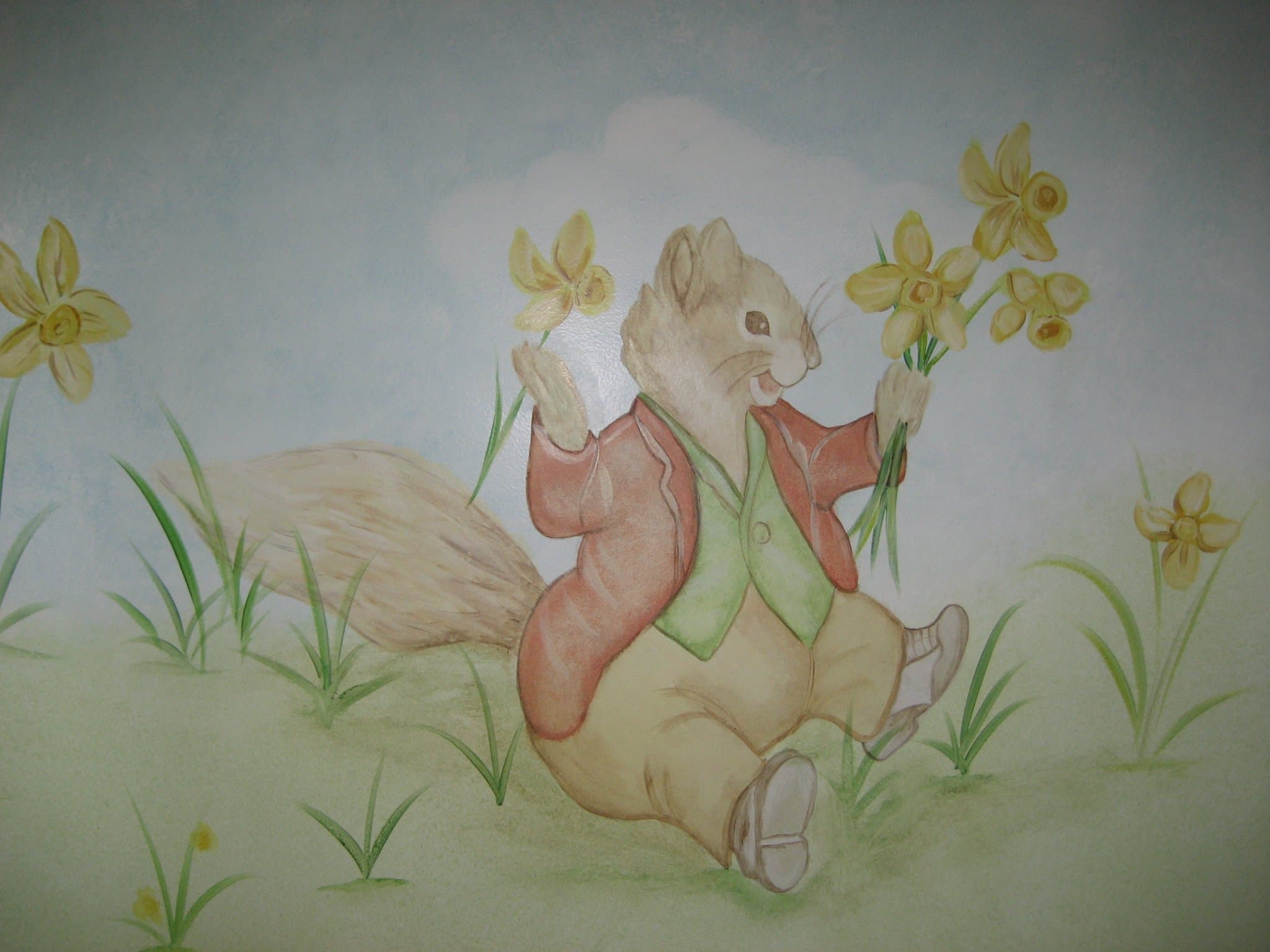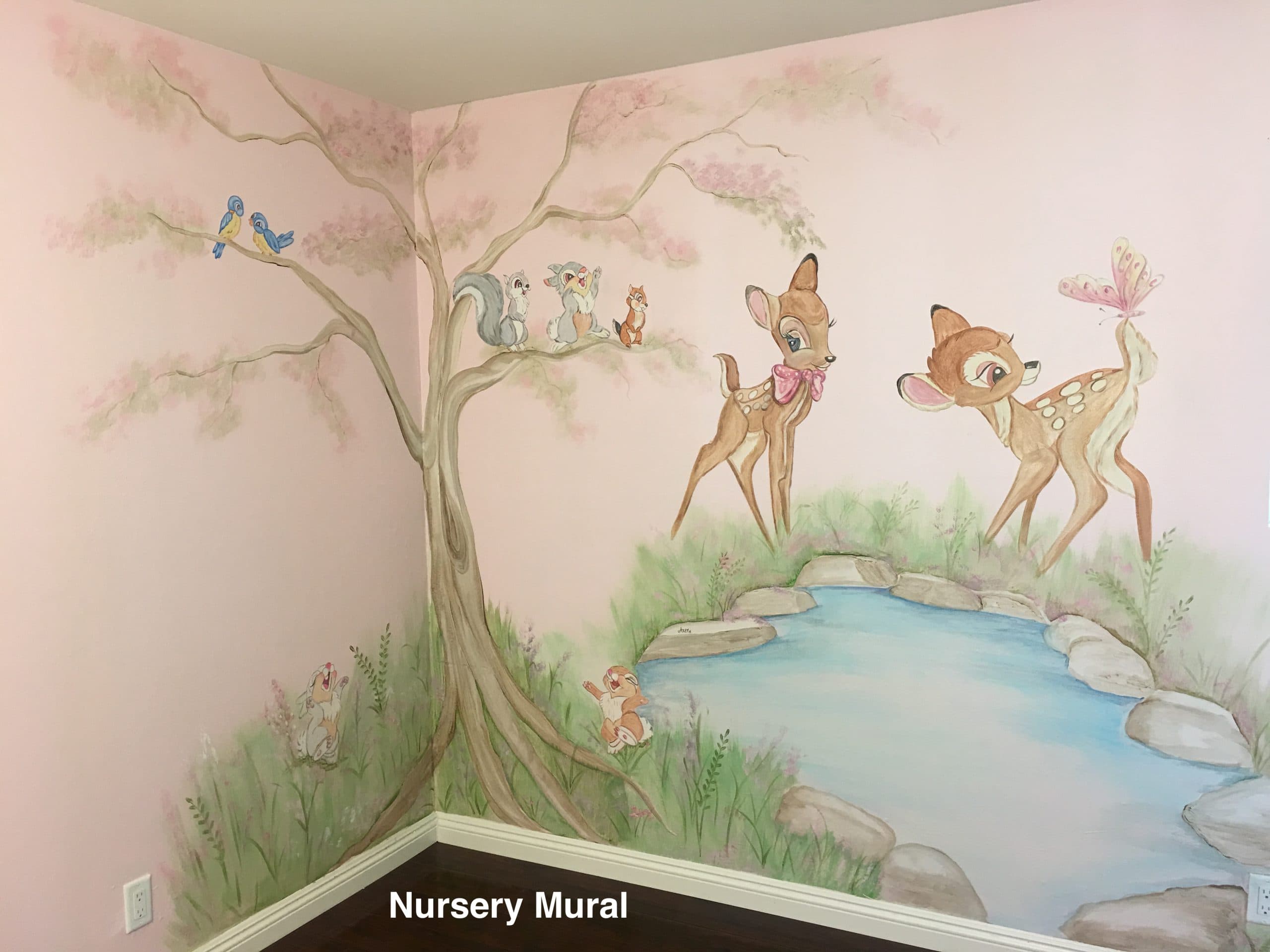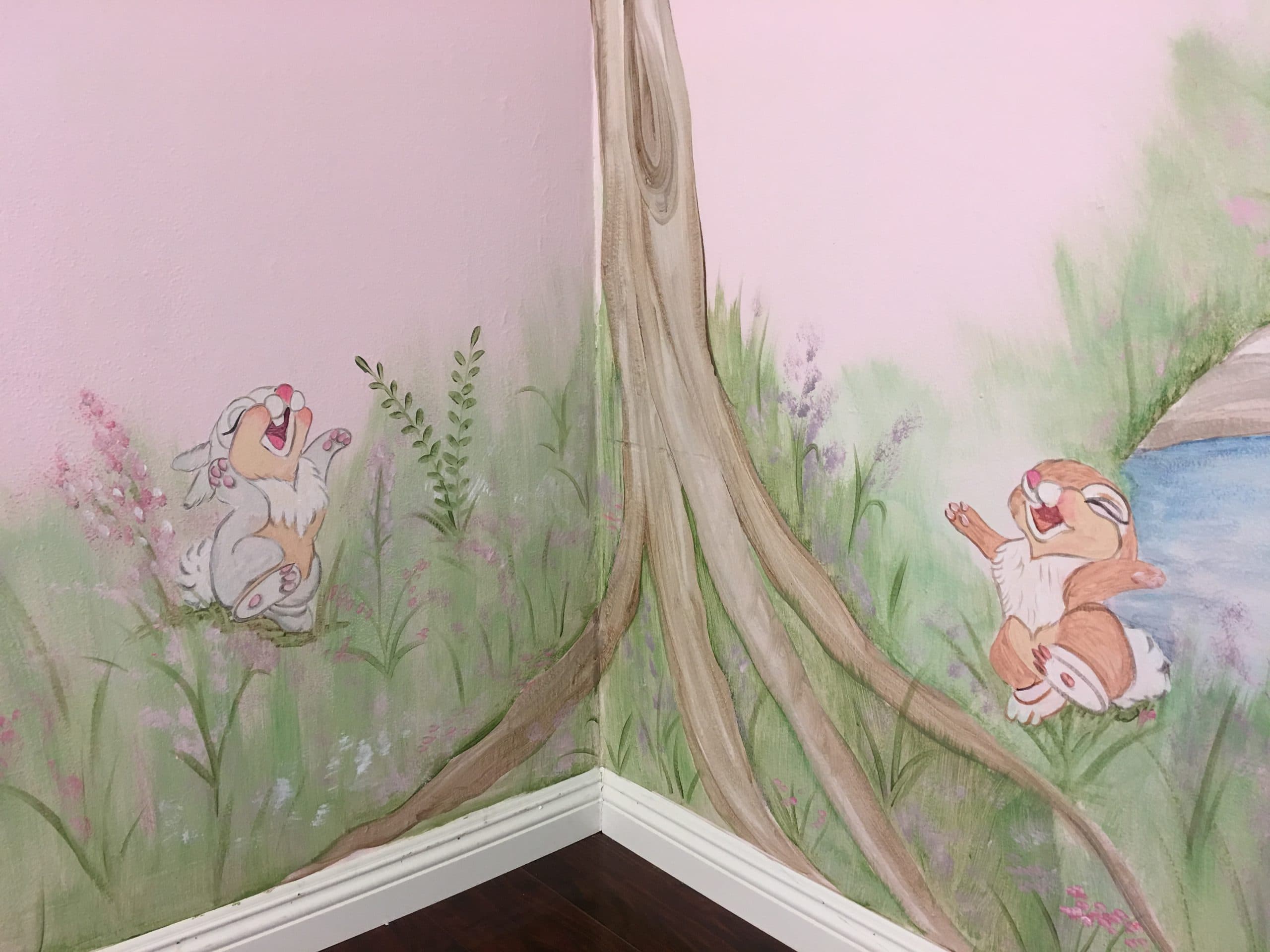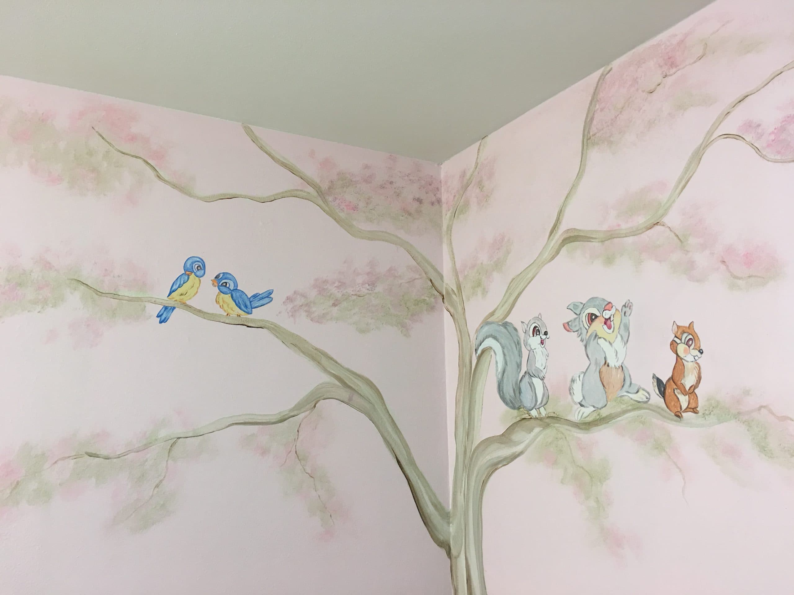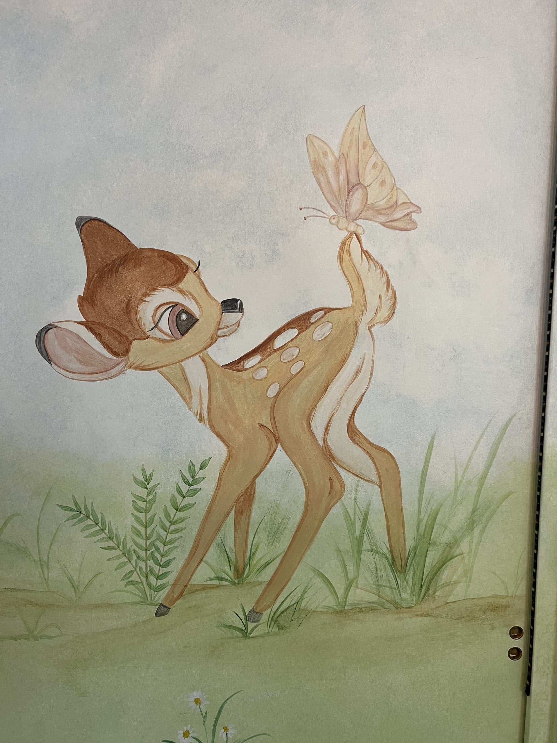 This adorable mural is perfect for a baby girl’s nursery, featuring a charming Bambi surrounded by soft pastel flowers. Delicate pink hues create a dreamy and calming atmosphere.