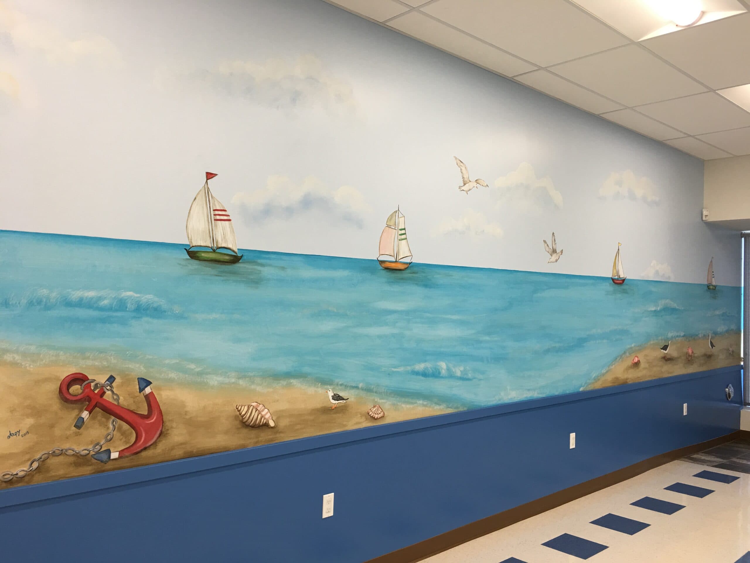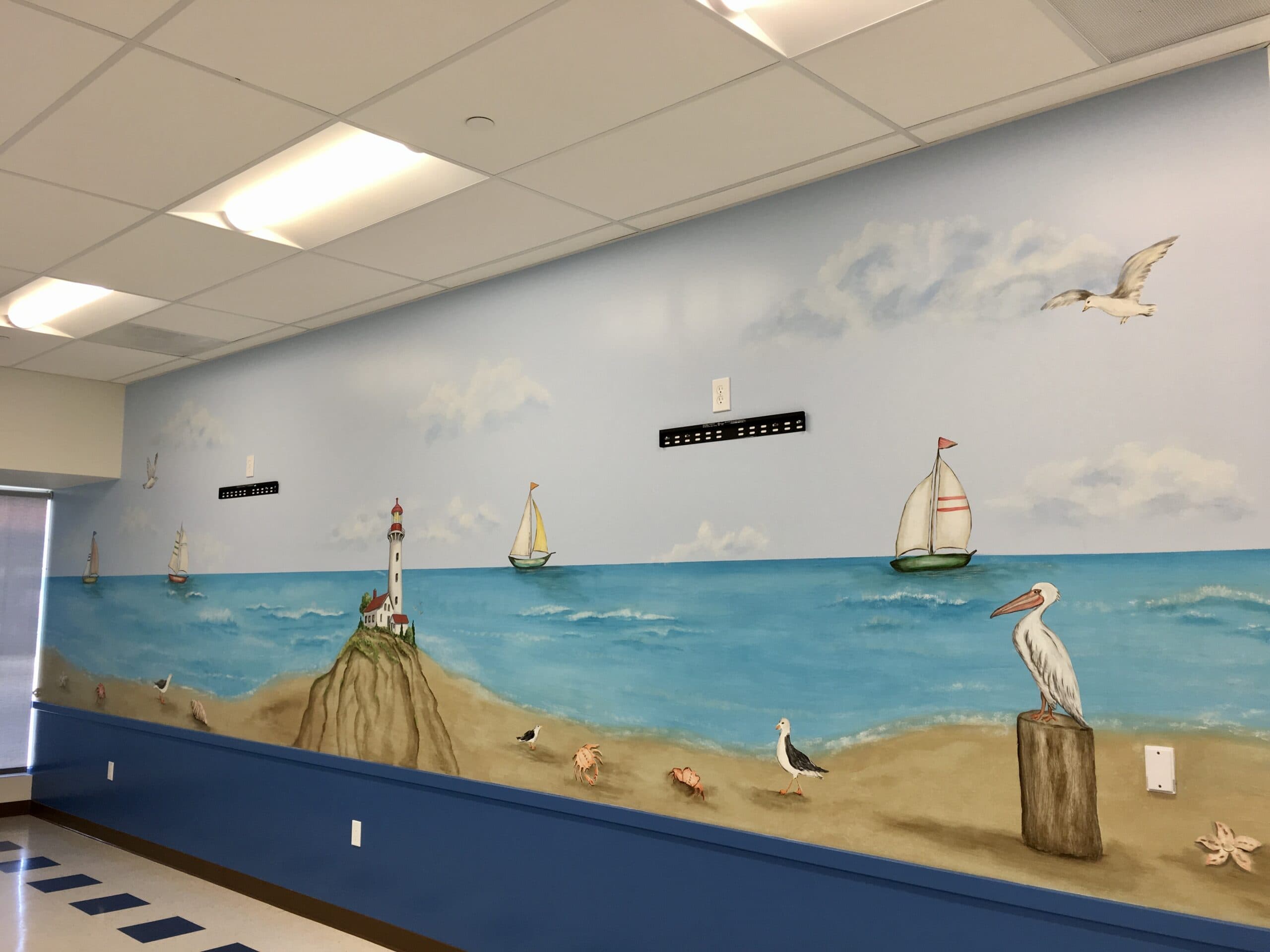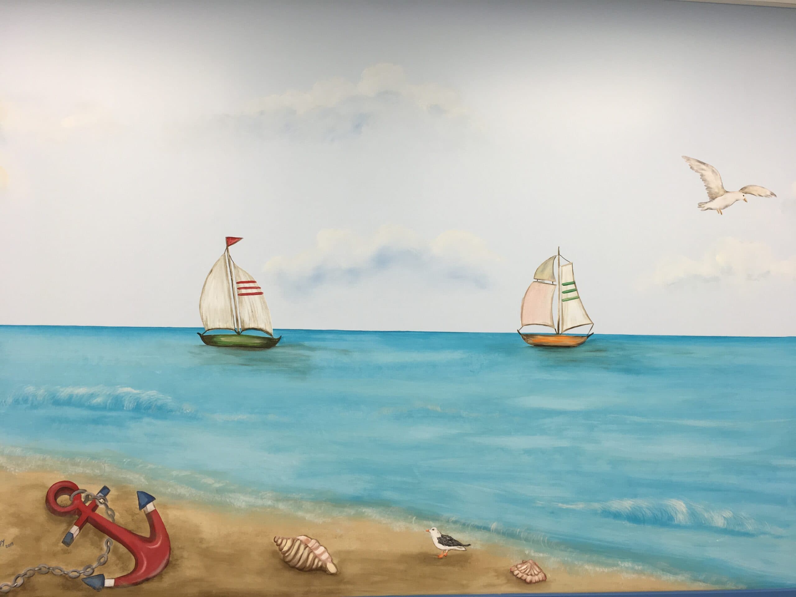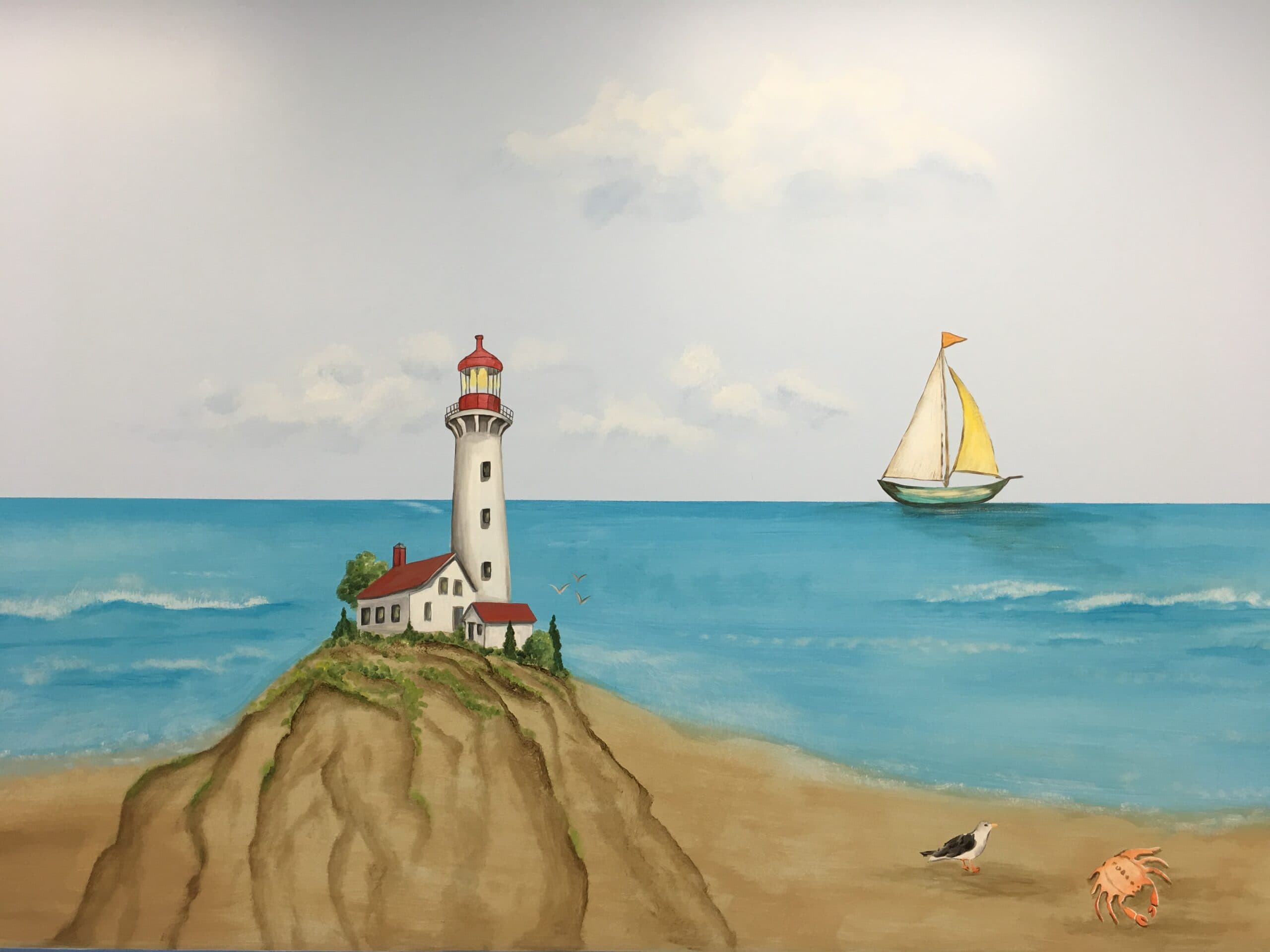 This hand-painted seascape mural transforms the pediatric office waiting room into a serene coastal retreat. Featuring a lighthouse, sailboats, and seagulls, the artwork creates a calming atmosphere designed to ease young patients and their families.