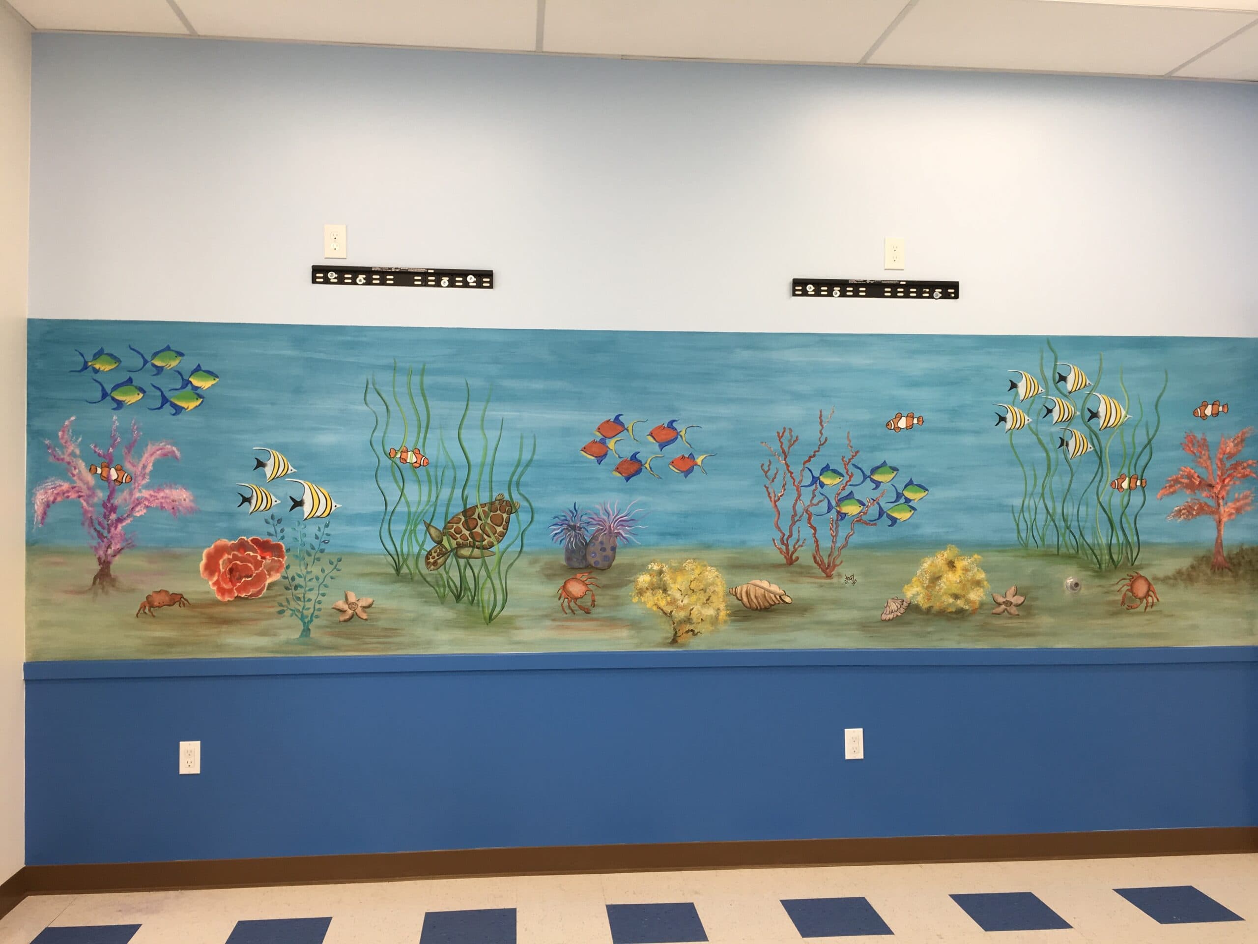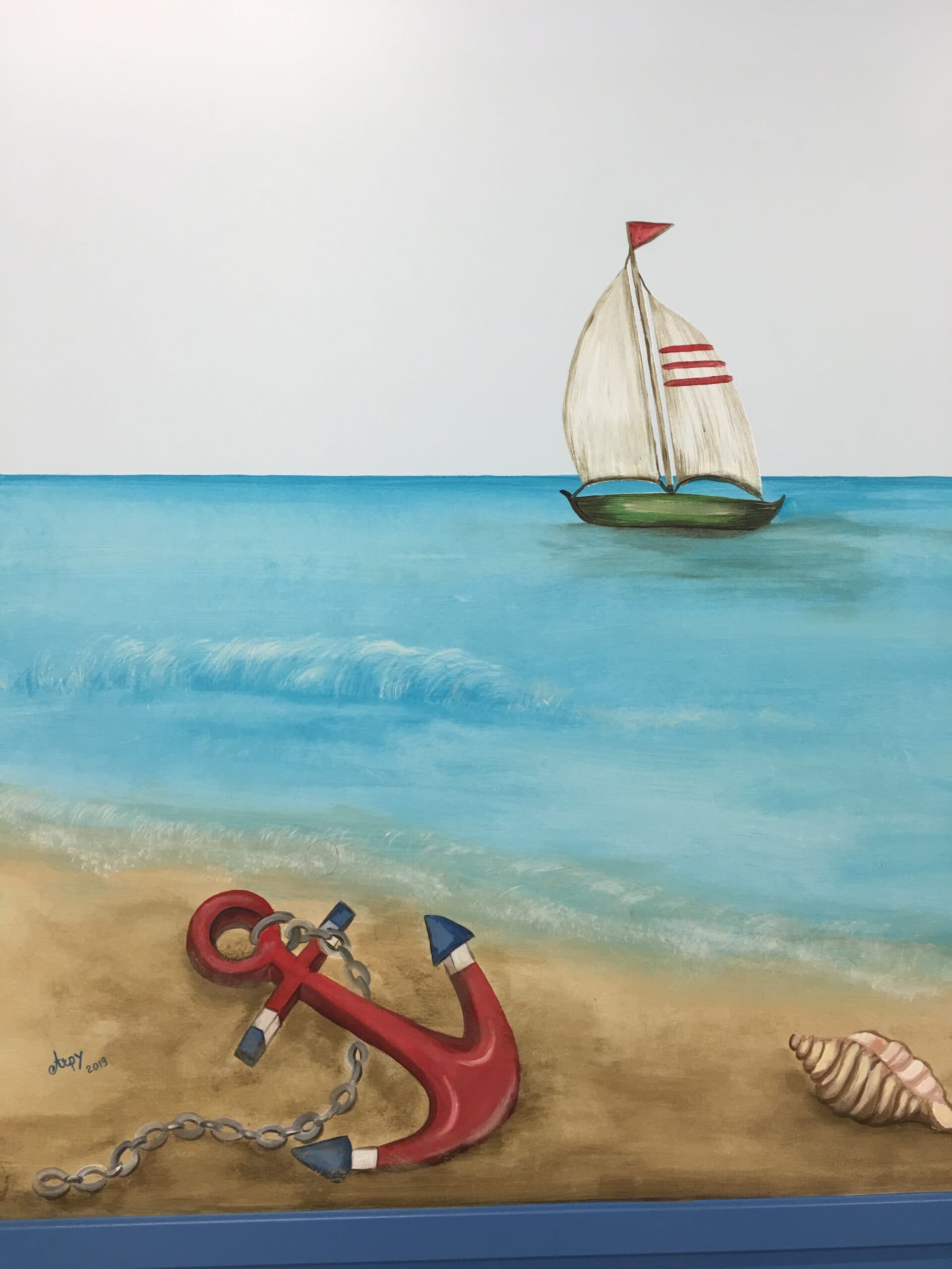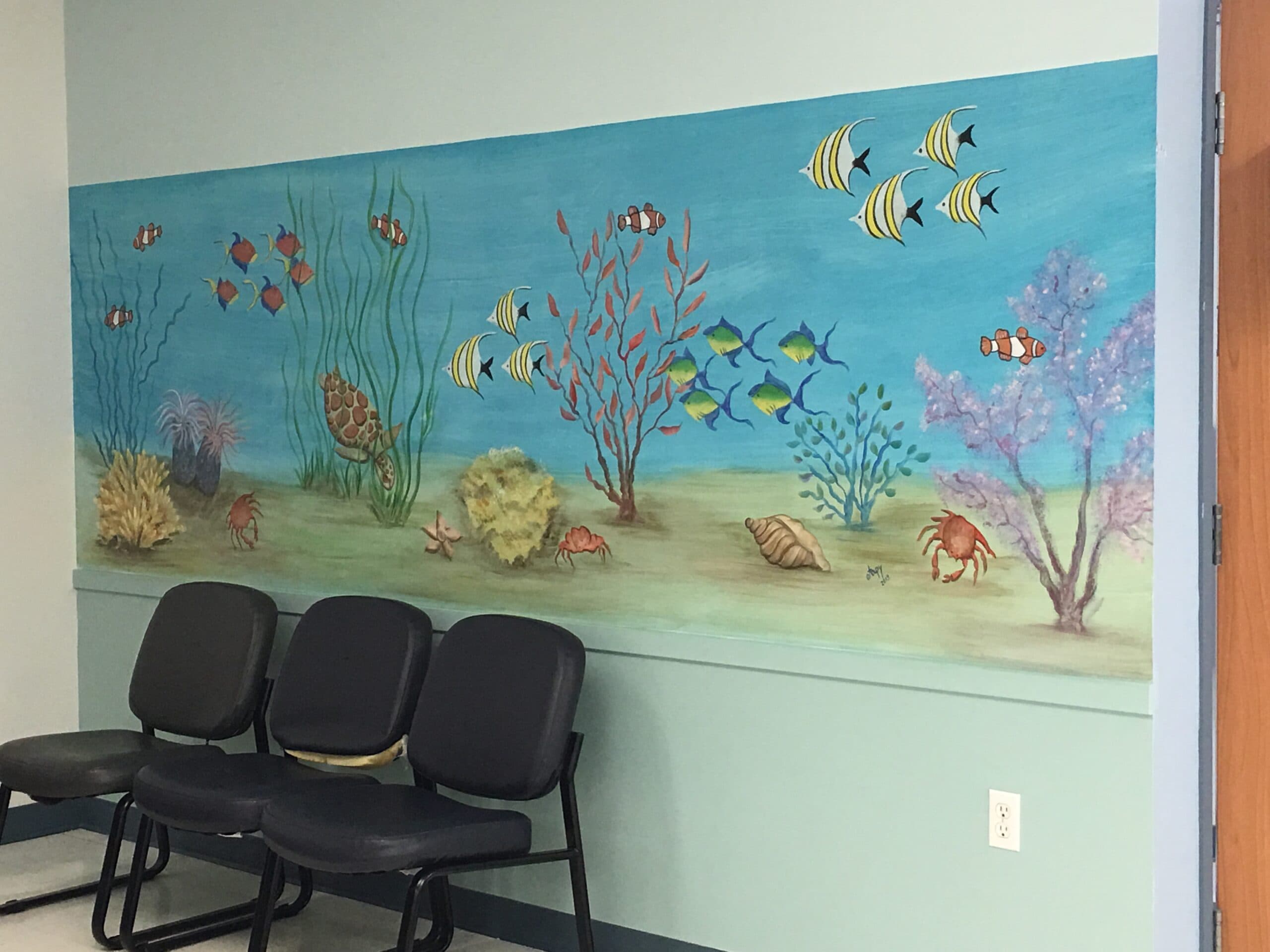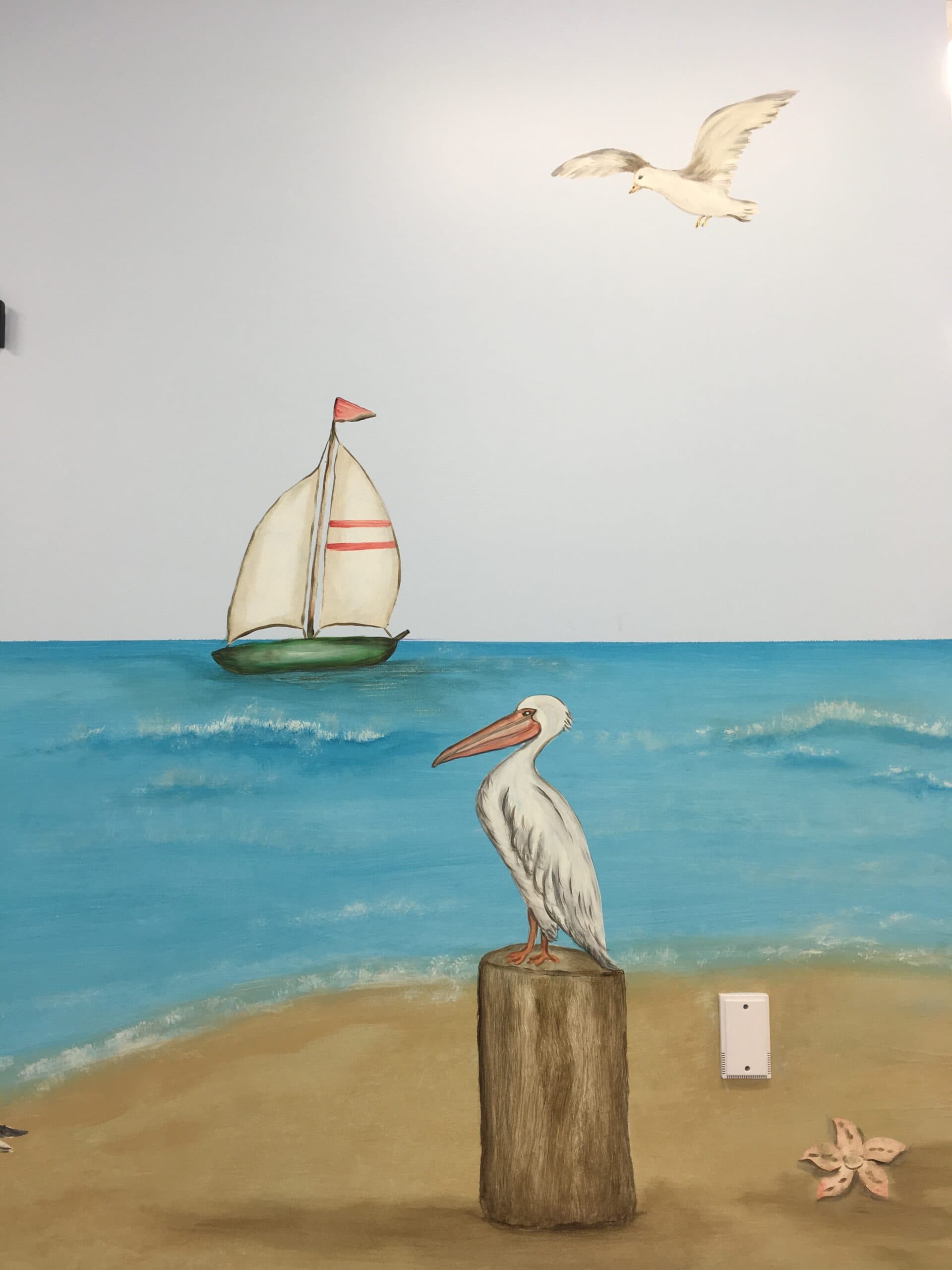 This hand-painted seascape mural transforms the pediatric office waiting room into a serene coastal retreat. Featuring a lighthouse, sailboats, and seagulls, the artwork creates a calming atmosphere designed to ease young patients and their families.
