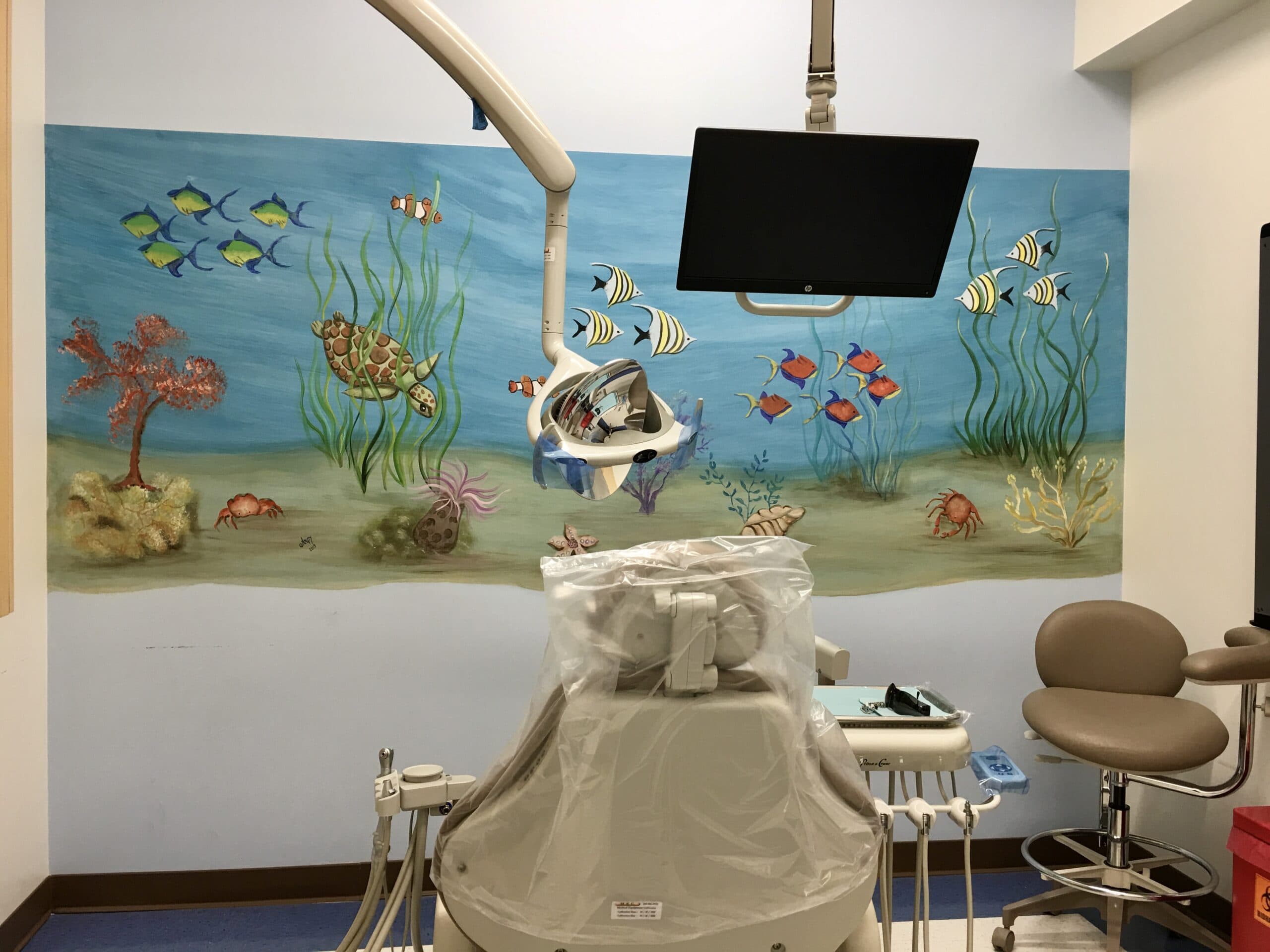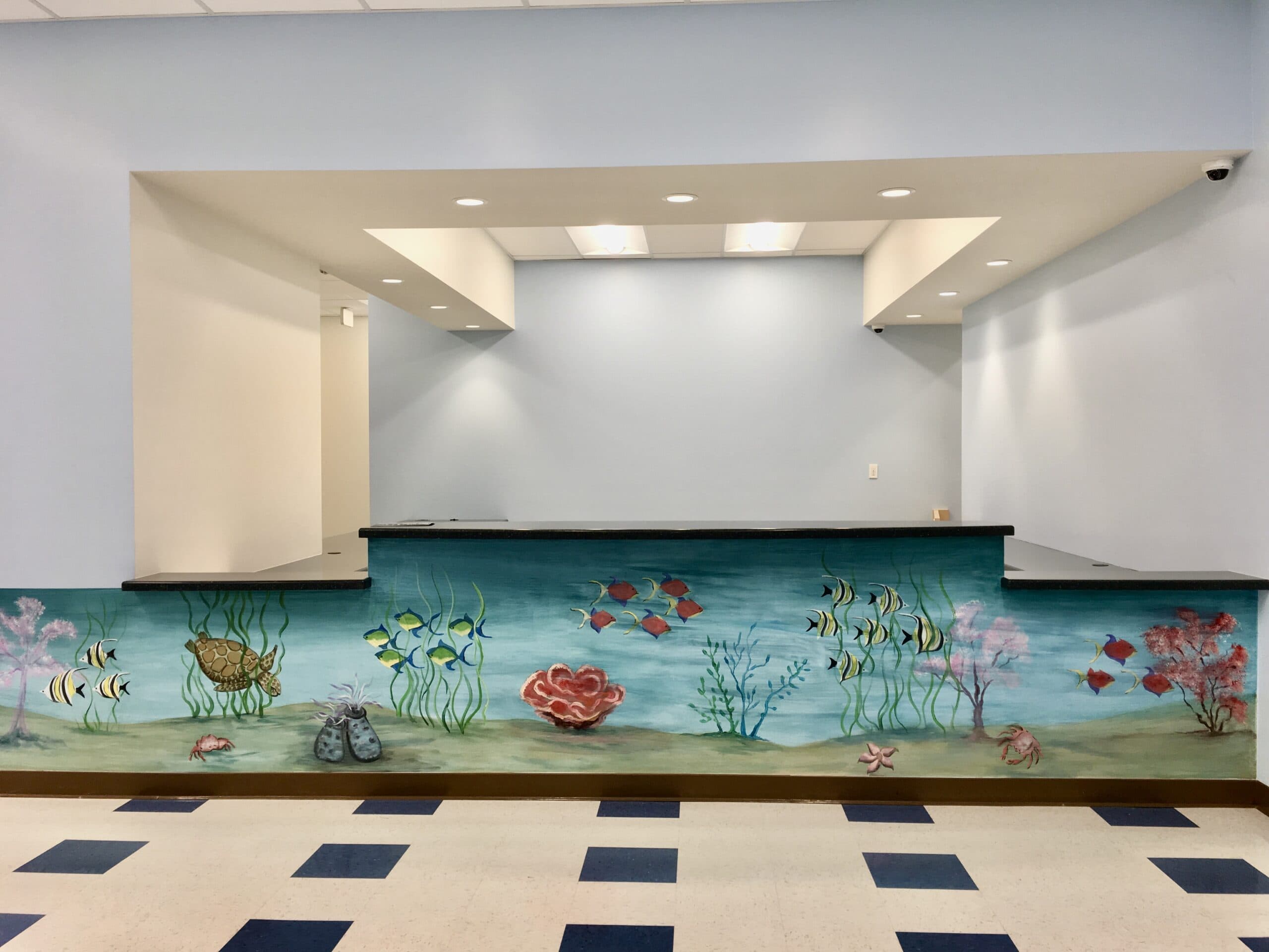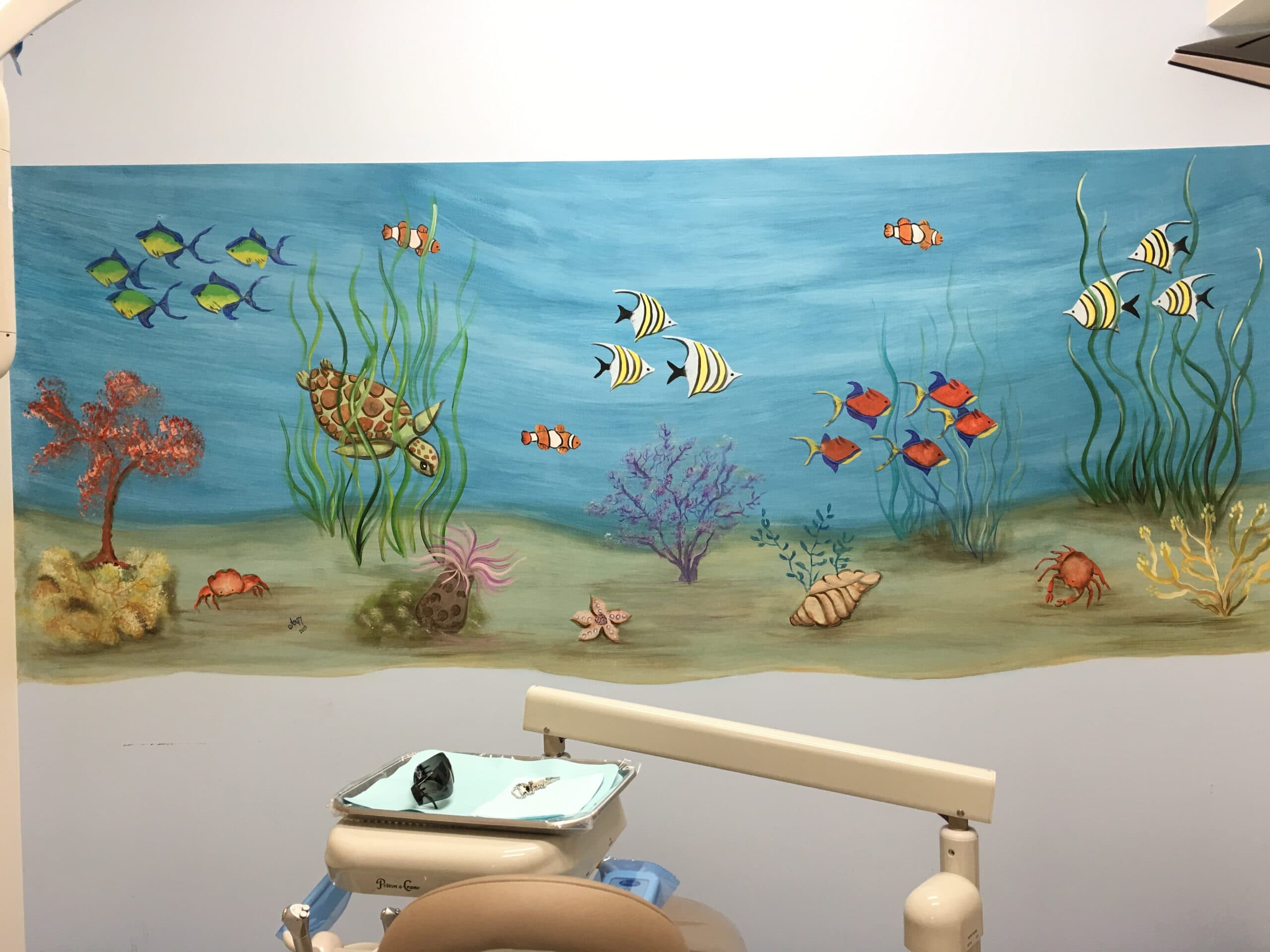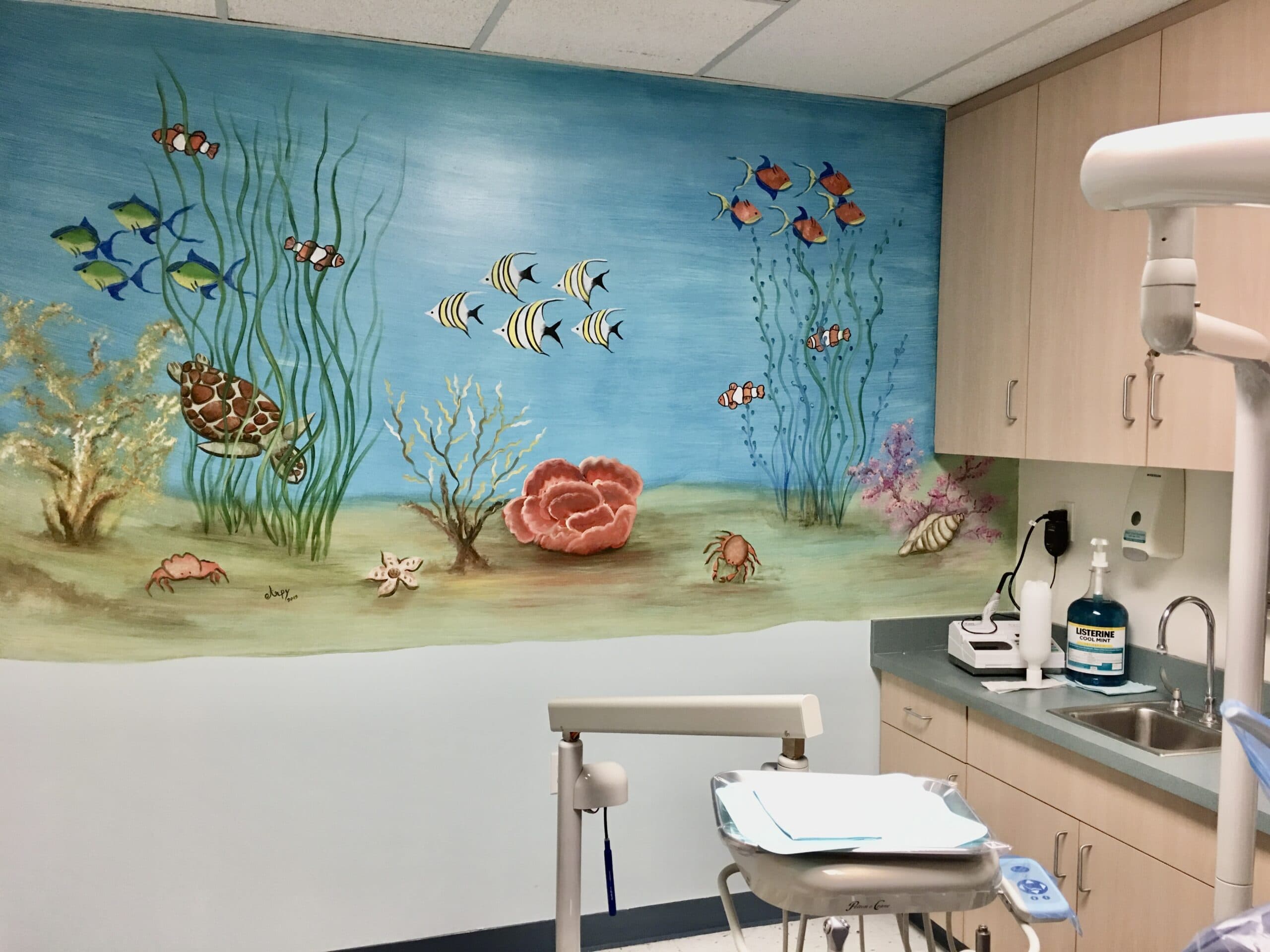 This vibrant coral reef mural transforms the reception hall and treatment rooms of a pediatric dentistry office into an underwater paradise. Filled with colorful corals, tropical fish, and gentle ocean waves, the artwork is designed to create a calming and welcoming atmosphere for young patients.