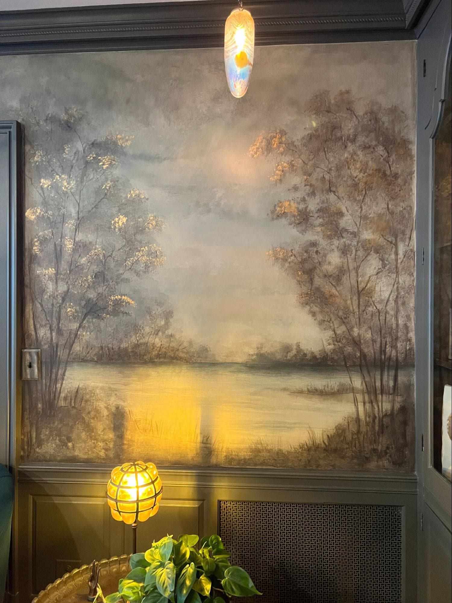 This mural captures a moody, atmospheric perspective, transporting viewers to a bygone era. Its soft, muted tones and painterly trees create depth, evoking the hidden charm of a speakeasy. The interplay of light and shadow enhances the space, blending seamlessly with its vintage-inspired decor.
