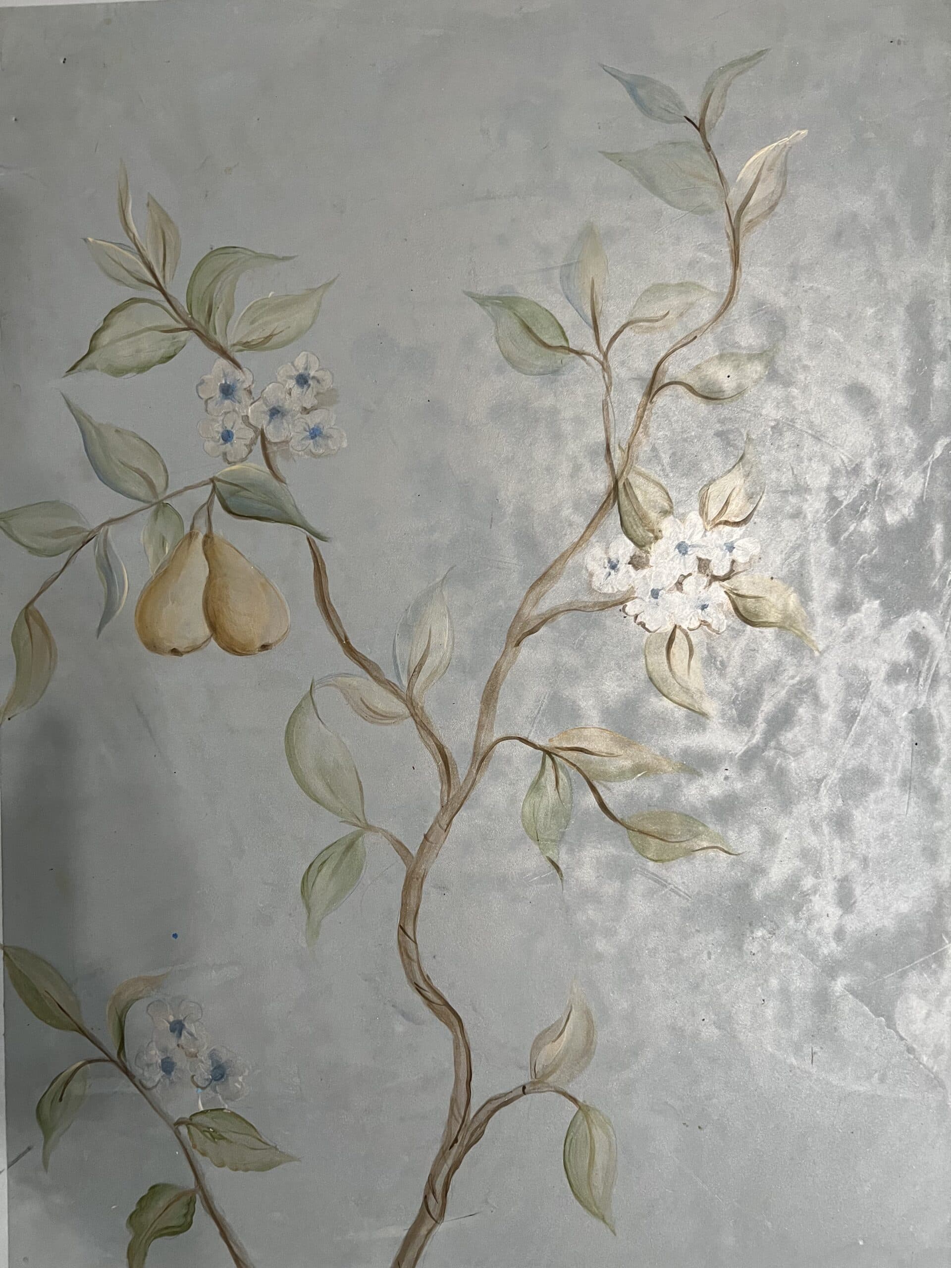 Hand-painted Chinoiserie mural is painted on a subtly shimmery plaster surface, designed to replicate the luxurious texture of silk fabric.